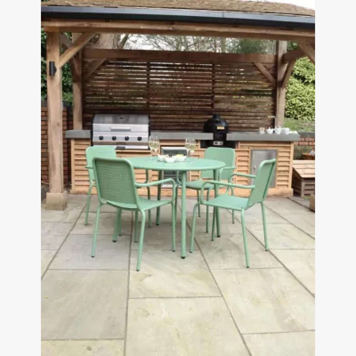 I love this set because of its versatile colour palette-olive and cream-which works well in both traditional and contemporary garden spaces. Its round table promotes easy conversation, making it perfect for casual family meals or outdoor brunches. The olive tone adds a touch of natural sophistication, so it pairs well with lush greenery or neutral outdoor cushions. Practical styling tips include adding some colourful outdoor cushions or a simple table runner for a splash of personality, and positioning it near potted plants or lanterns to create a relaxed, inviting atmosphere. This set’s neutral yet fresh aesthetic makes it adaptable to various garden styles, from rustic to modern patios.