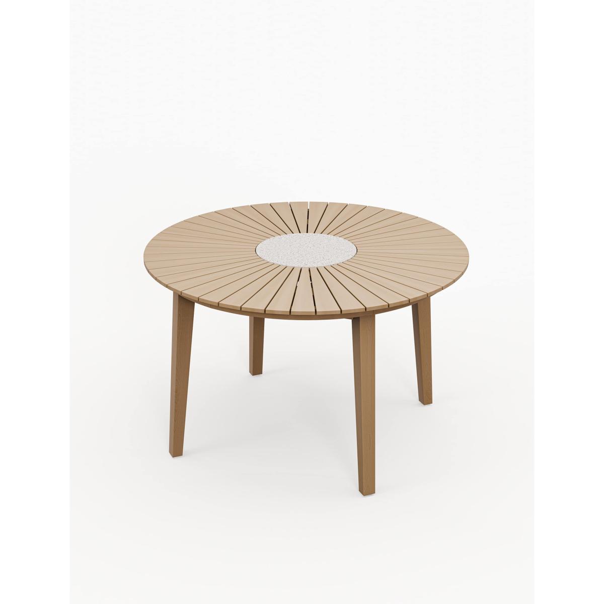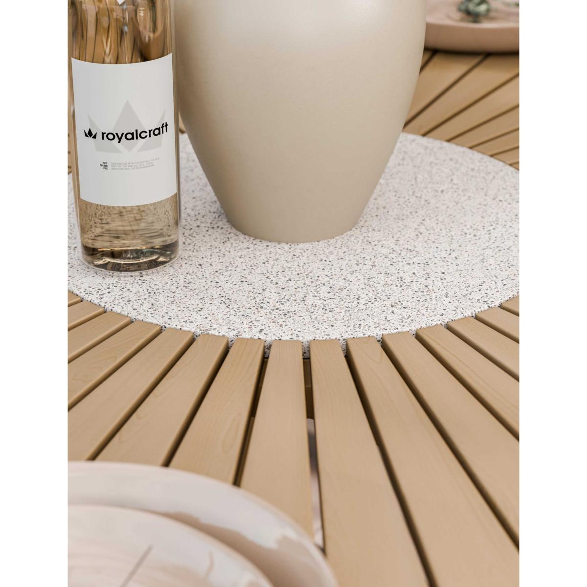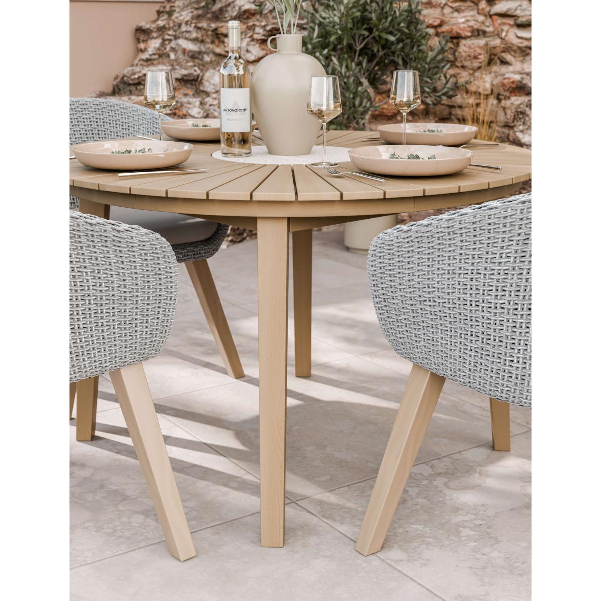 The Roma garden set from Royalcraft blends the warmth of acacia hardwood with the modern appeal of rattan. Its round table features a striking sunray design and a protective PU finish. Six dining chairs provide both comfort and style.