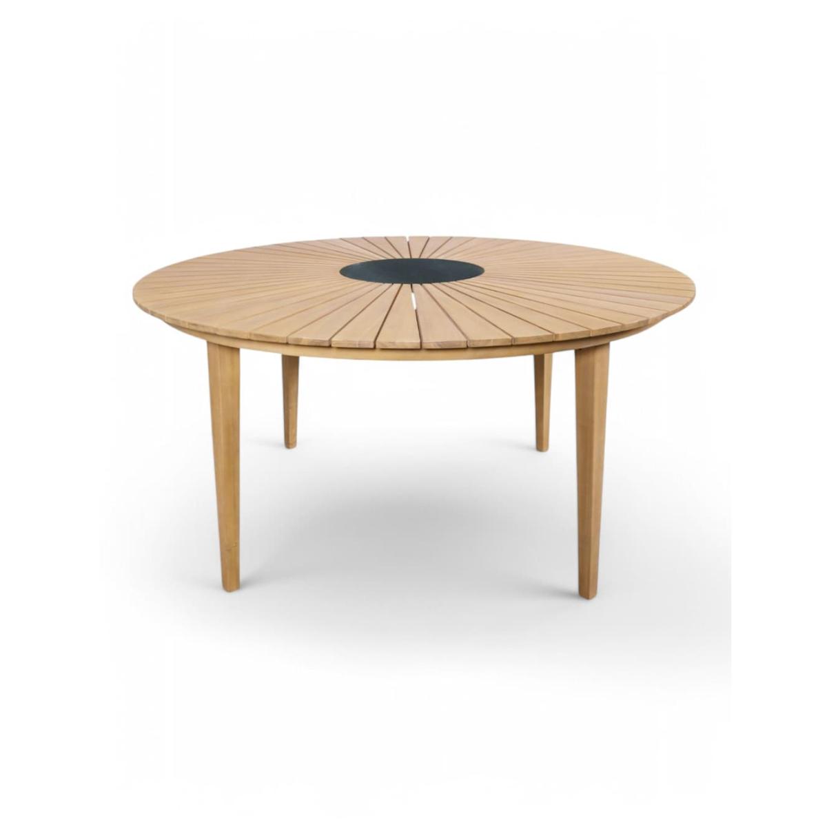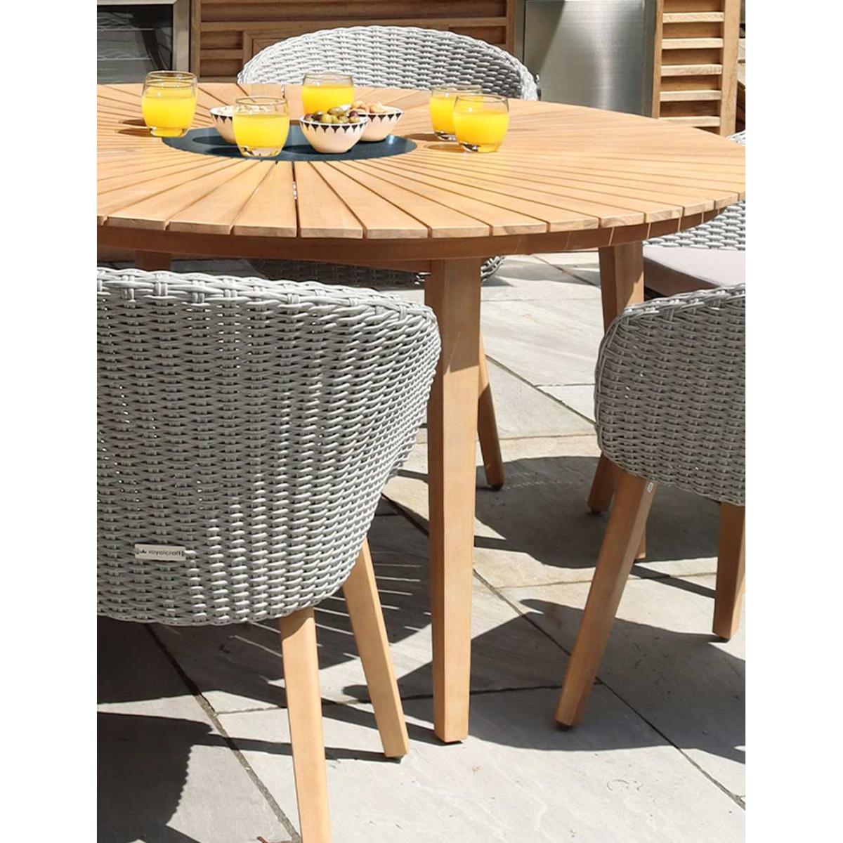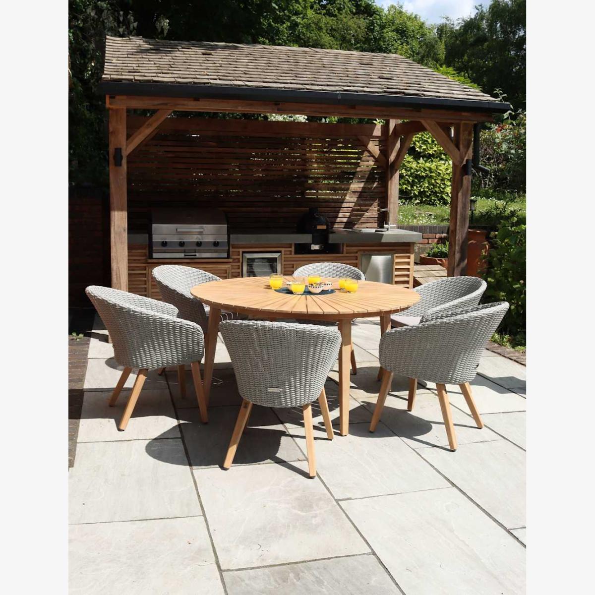 Entertain in style with the Roma garden dining set from Royalcraft. The round wooden table features sunray grooves and is complete with a granite centrepiece for a modern touch. It's complemented by six Sol chairs, each wrapped in textured rattan and with a comfy seat cushion.