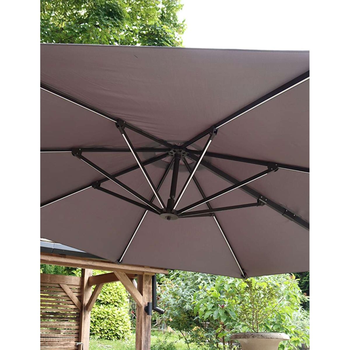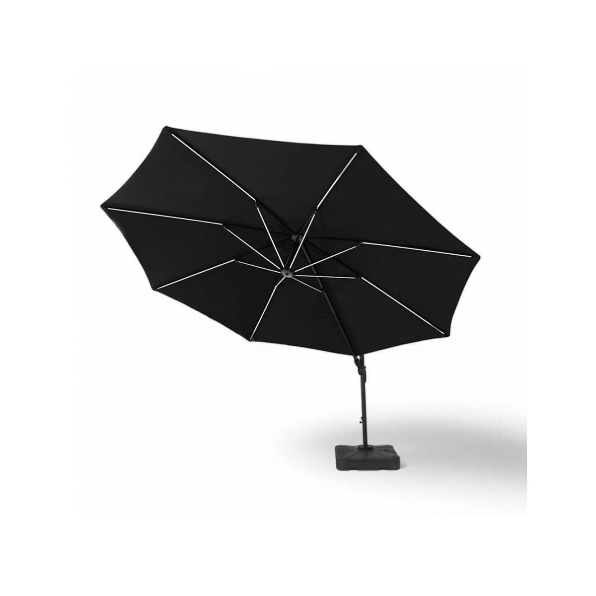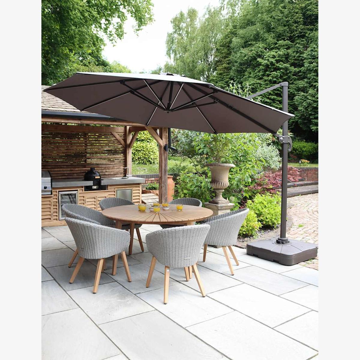 This Royalcraft round parasol features twinkling LED lights underneath, so you can enjoy your outdoor space both day and night. It's made from durable weather-proof fabric with a UPF 50 finish for sun protection and comes with a sturdy base for freestanding use. To effortlessly create a perfectly shaded spot, its cantilever design has an easy handle and can be adjusted to six different heights.