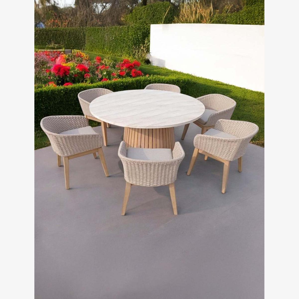 I love the Saturn six-seater as it offers both style and practicality for outdoor dining. Its natural mix finish makes it versatile, working well in contemporary or rustic garden settings. The woven texture of the chairs adds a touch of warmth, and the round table encourages convivial gatherings. For styling tips, consider pairing it with neutral cushions for added comfort or a colourful parasol to create a focal point. It also works well with modern planters or string lighting to elevate the outdoor space into a stylish retreat. This set is particularly ideal for those looking to combine durability with a relaxed yet sophisticated look.