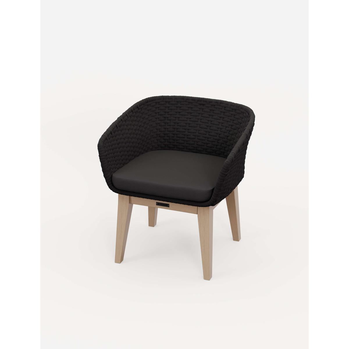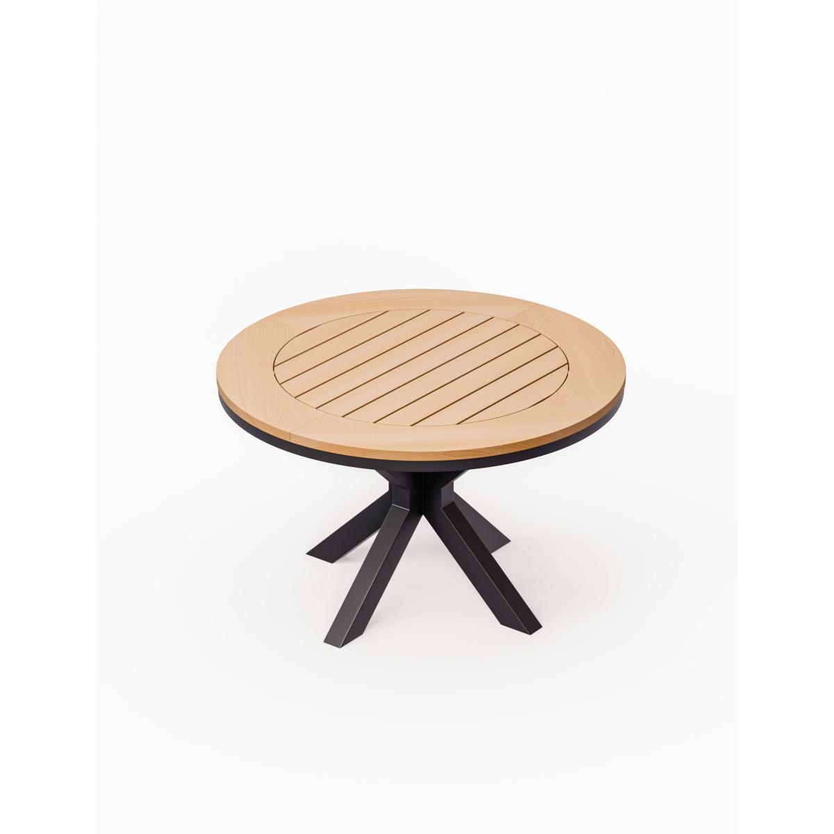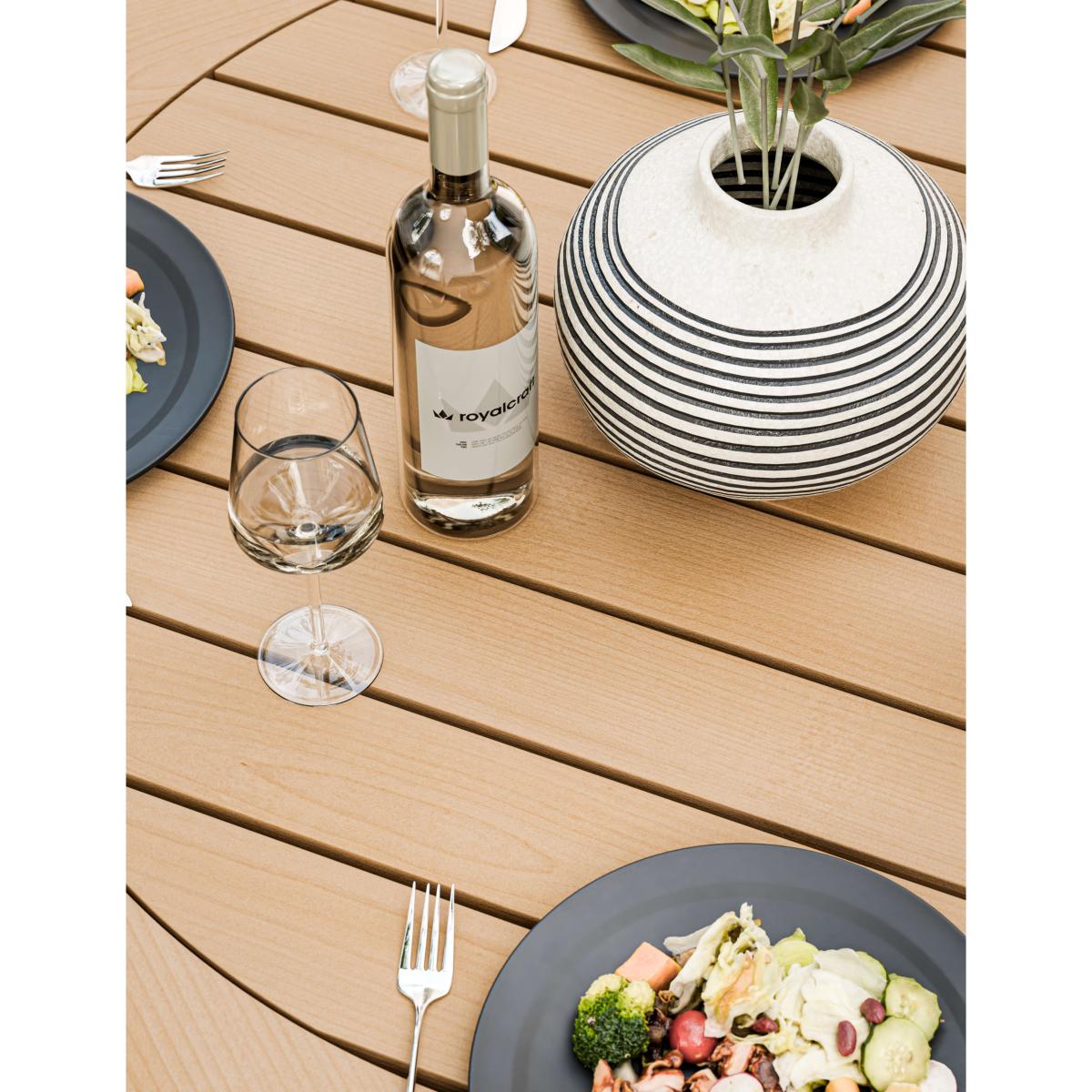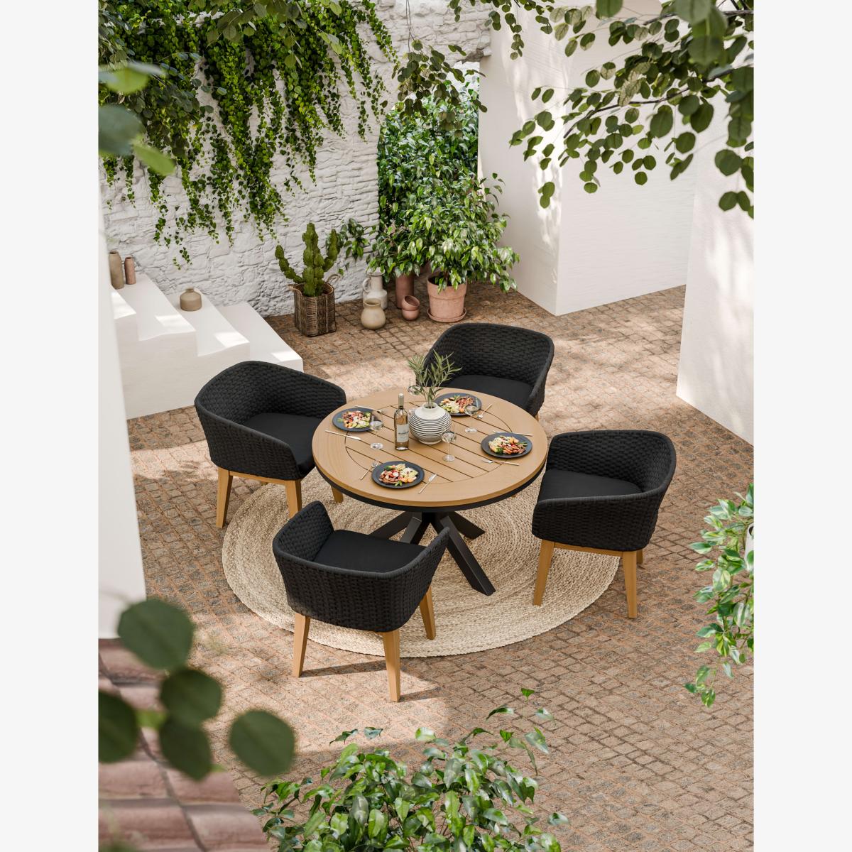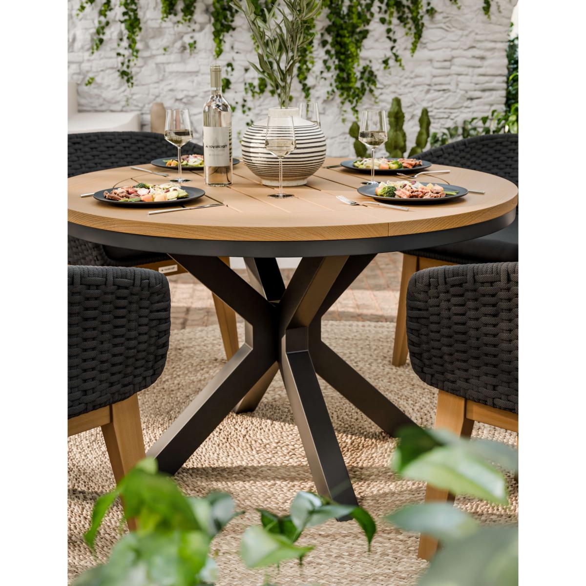 This garden set from Royalcraft combines modern aluminium with premium teak wood details. The round dining table offers plenty of space to seat guests while you entertain. It is complemented by four Eden-style chairs, each crafted with chunky wooden legs and complete with textured rope detailing.