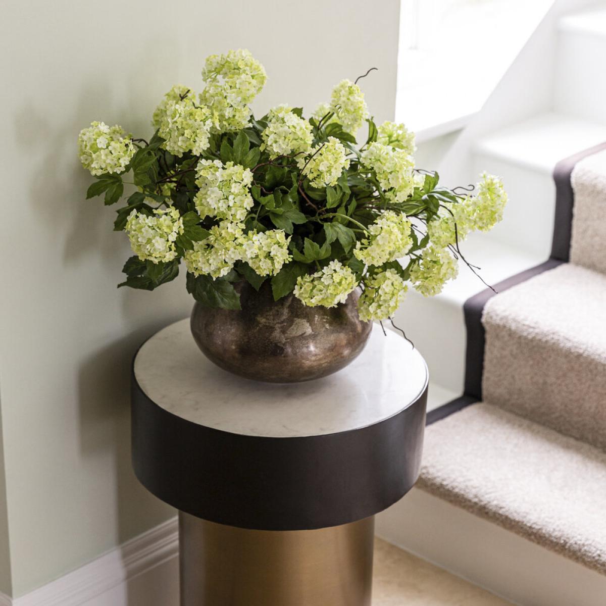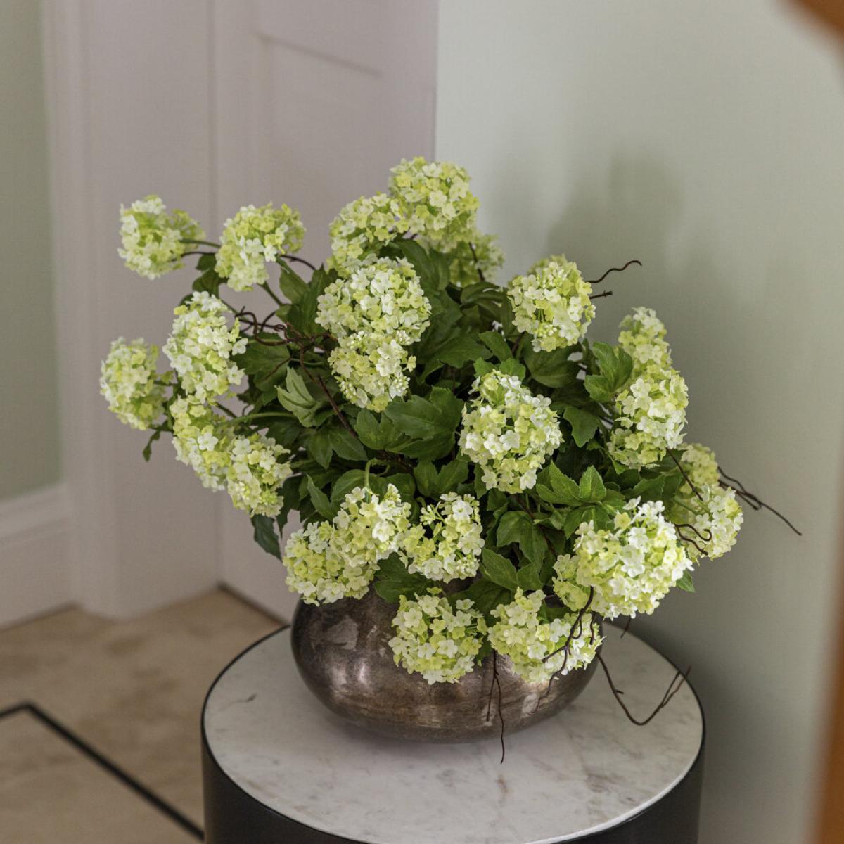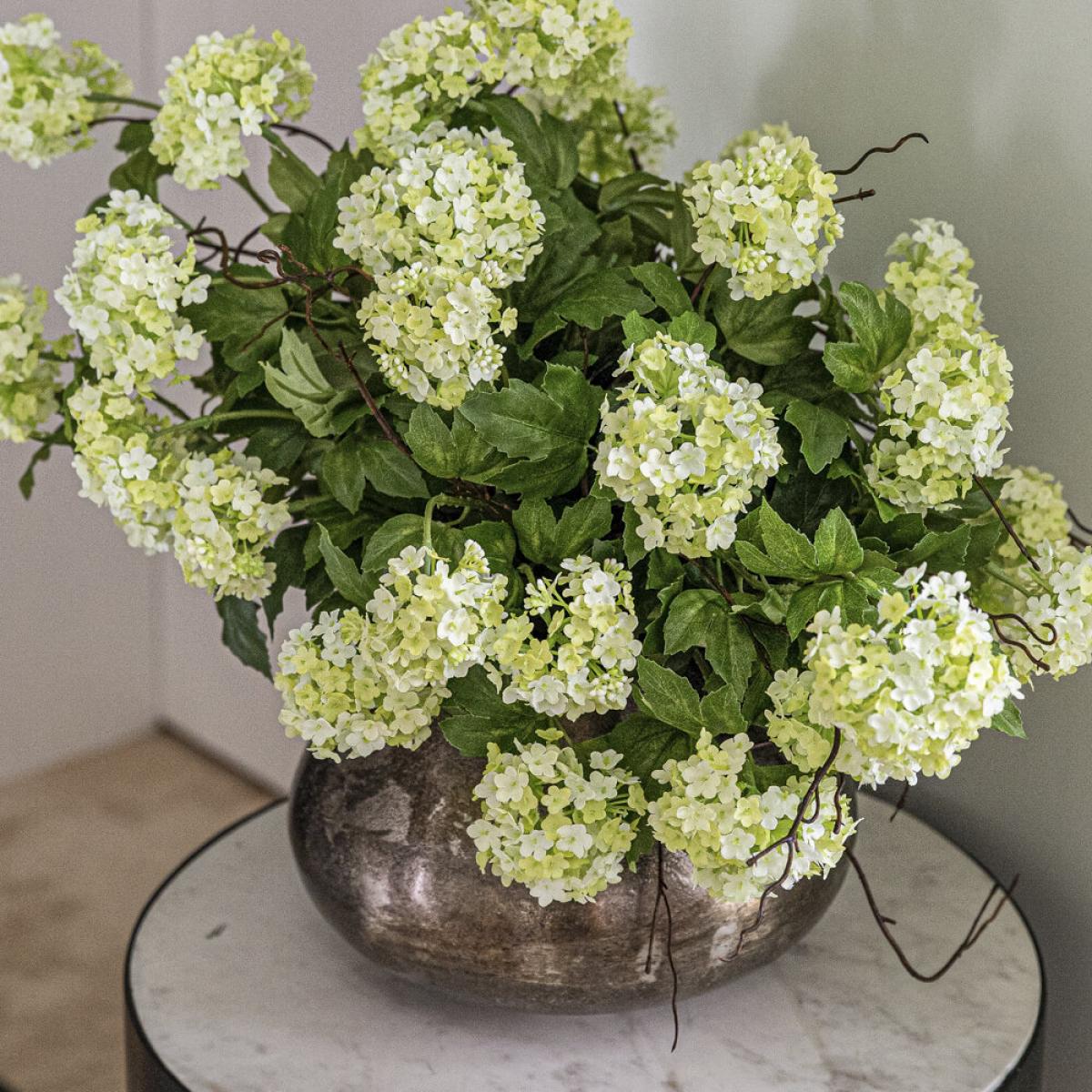I love this little pot for adding a touch of natural elegance to a variety of interiors. Its nickel finish gives a modern, sleek edge that works particularly well in minimalist, contemporary, or industrial spaces. The Guelder Rose and twigs create a fresh, organic feel, making it perfect for dressing up side tables, shelves, or mantlepieces. For styling tips, consider pairing it with other metal accents or contrasting textures like wood or stone to enhance its visual appeal. It works well as a standalone centrepiece or grouped with similar floral arrangements for a more layered look. Practicality-wise, it’s a versatile piece that can easily be moved around to suit different spaces and occasions.