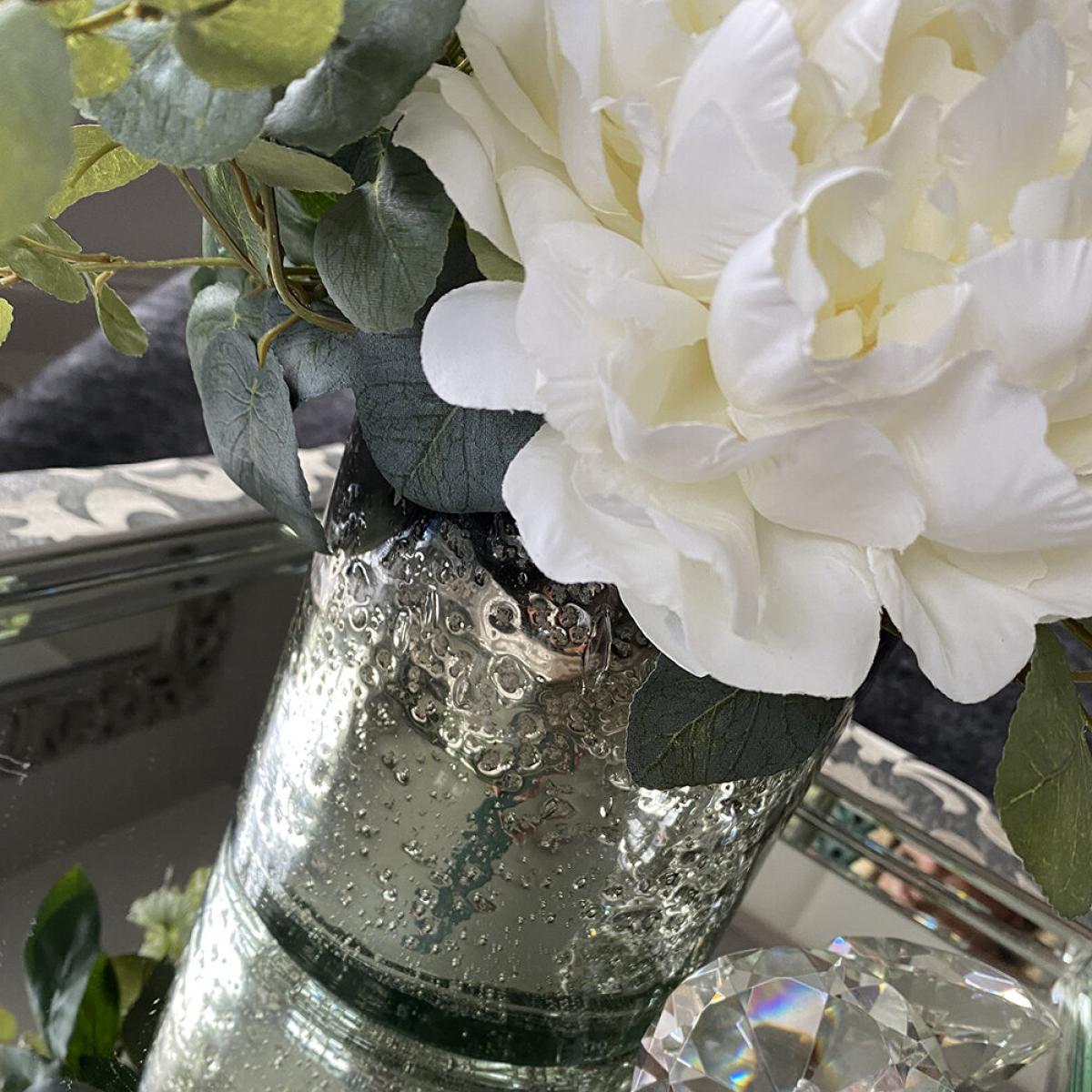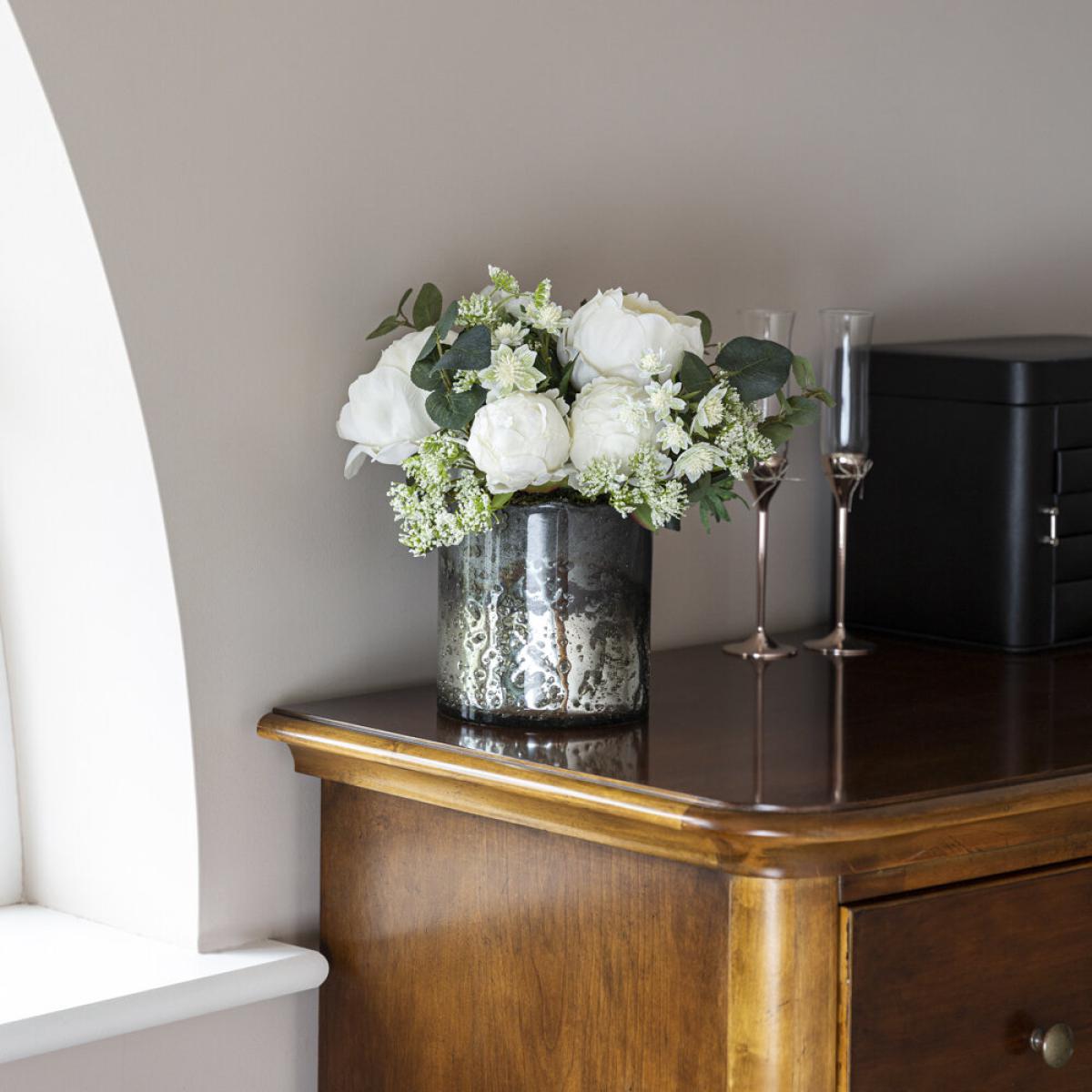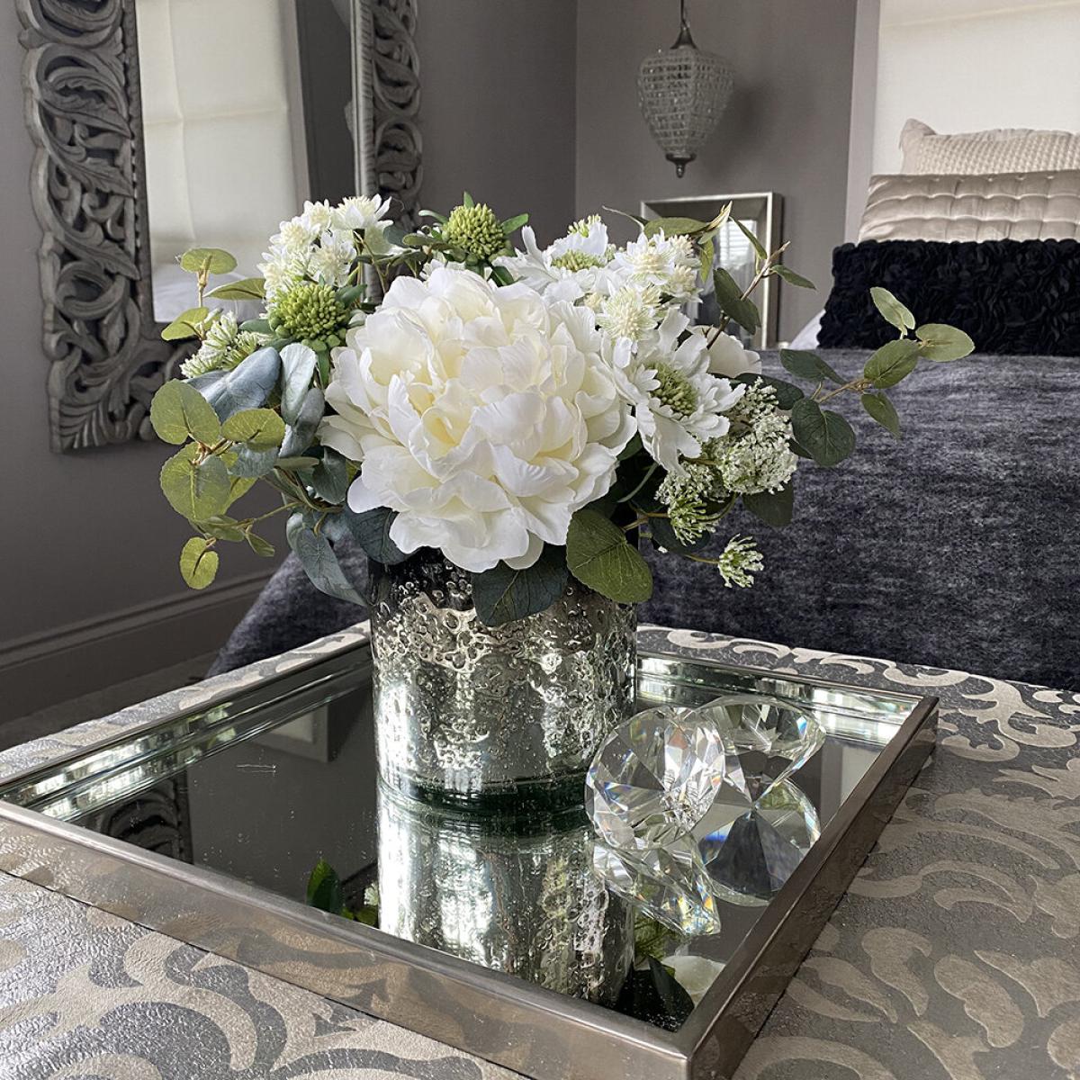 I love the peony mix arrangement in the silver glass vase for its timeless elegance and versatility. It works particularly well in modern or minimalist interiors, where the reflective surface of the vase adds a sophisticated touch without overpowering the decor. Practical styling tips include placing this arrangement on a side table or in a console to create a focal point, and pairing it with neutral tones or soft textures for a harmonious look. Given its lush and fresh appearance, it also works beautifully in spaces where a touch of nature is needed, such as living rooms, offices, or dining areas, adding both colour and vitality with ease.
