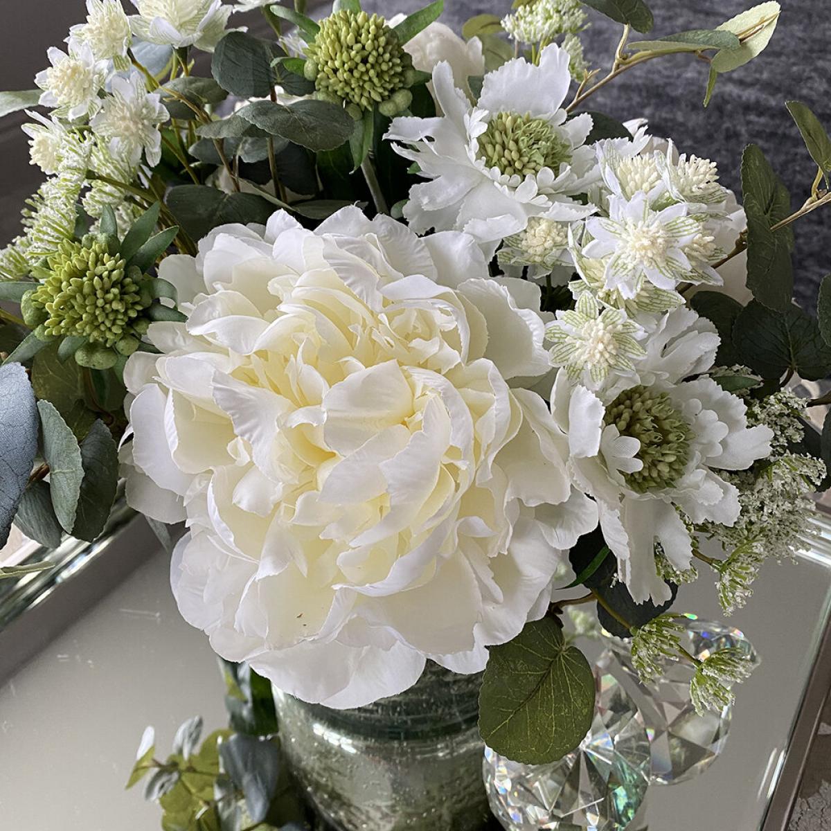 Fuss-free and long-lasting, this artificial floral arrangement is oh-faux fabulous. Exclusive to AMARA, it features a beautiful mix of peonies displayed with scabiosa, astrantia, and Queen Anne's lace in a silver mottled vase. To keep your flowers looking fabulous for longer, keep them out of direct sunlight.