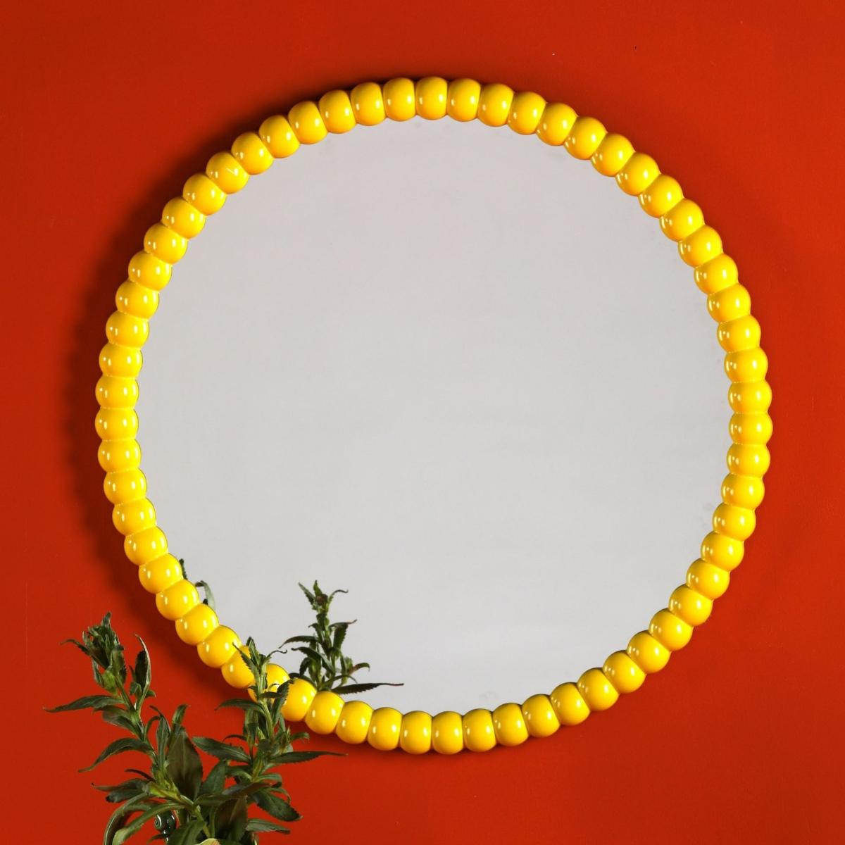 Ruan round wall mirror, featuring a yellow wooden bobbin frame. The Ruan mirror brings a touch of character and charm to your home with its unique and playful design. It features a bold circular shape surrounded by a yellow wooden bobbin frame, giving it a sculptural, maximalist appeal. The bobbin detailing adds texture and dimension, creating a standout focal point that draws the eye. Ideal for adding a pop of colour to living spaces, hallways or bedrooms, the Ruan mirror pairs functionality with artistic flair. Its distinctive frame complements both eclectic and contemporary interiors, making it a stylish and versatile accent piece that brightens and personalises any room. Ruan round wall mirror, featuring a yellow wooden bobbin frame. The Ruan mirror brings a touch of character and charm to your home with its unique and playful design. It features a bold circular shape surrounded by a yellow wooden bobbin frame, giving it a sculptural, maximalist appeal. The bobbin detailing adds texture and dimension, creating a standout focal point that draws the eye. Ideal for adding a pop of colour to living spaces, hallways or bedrooms, the Ruan mirror pairs functionality with artistic flair. Its distinctive frame complements both eclectic and contemporary interiors, making it a stylish and versatile accent piece that brightens and personalises any room.