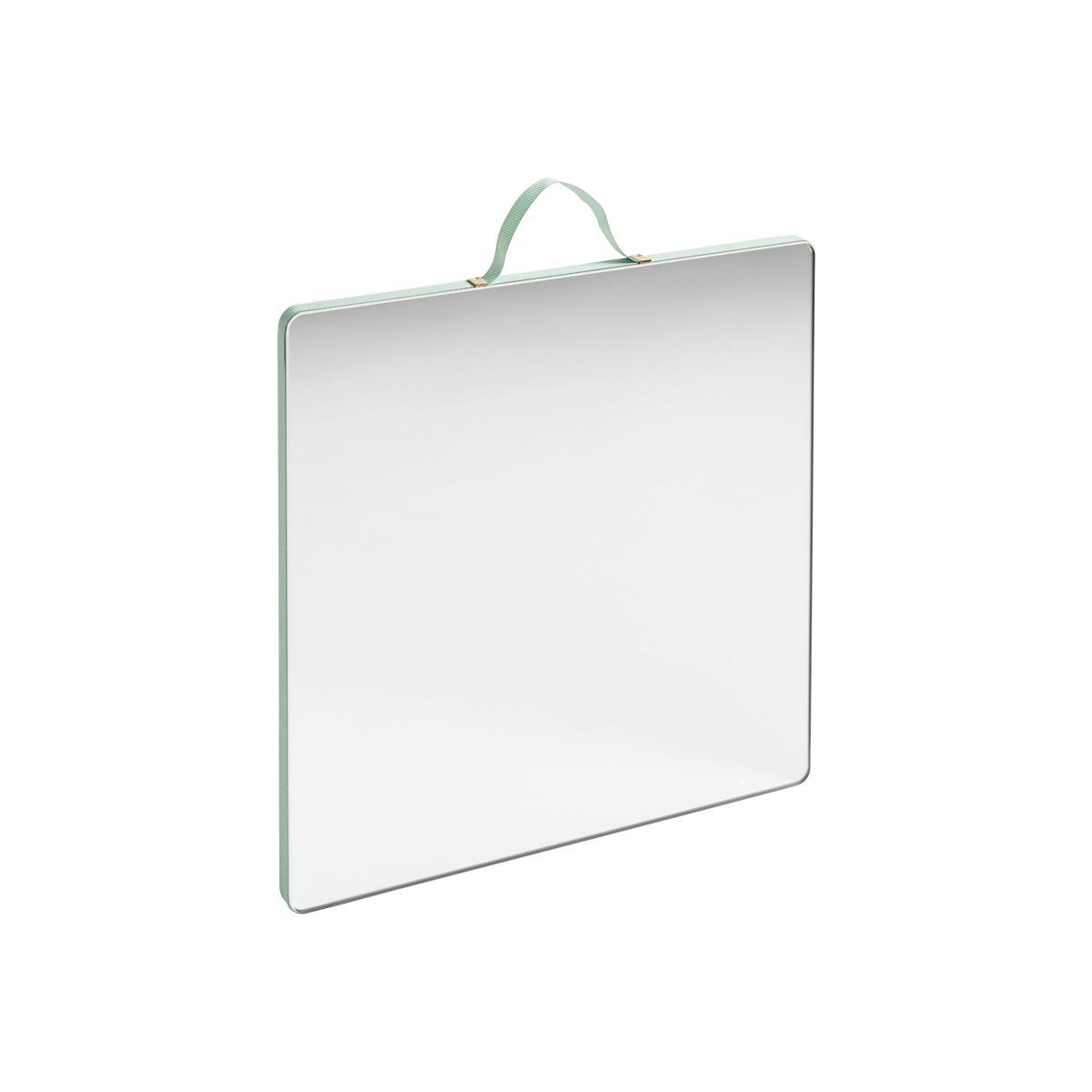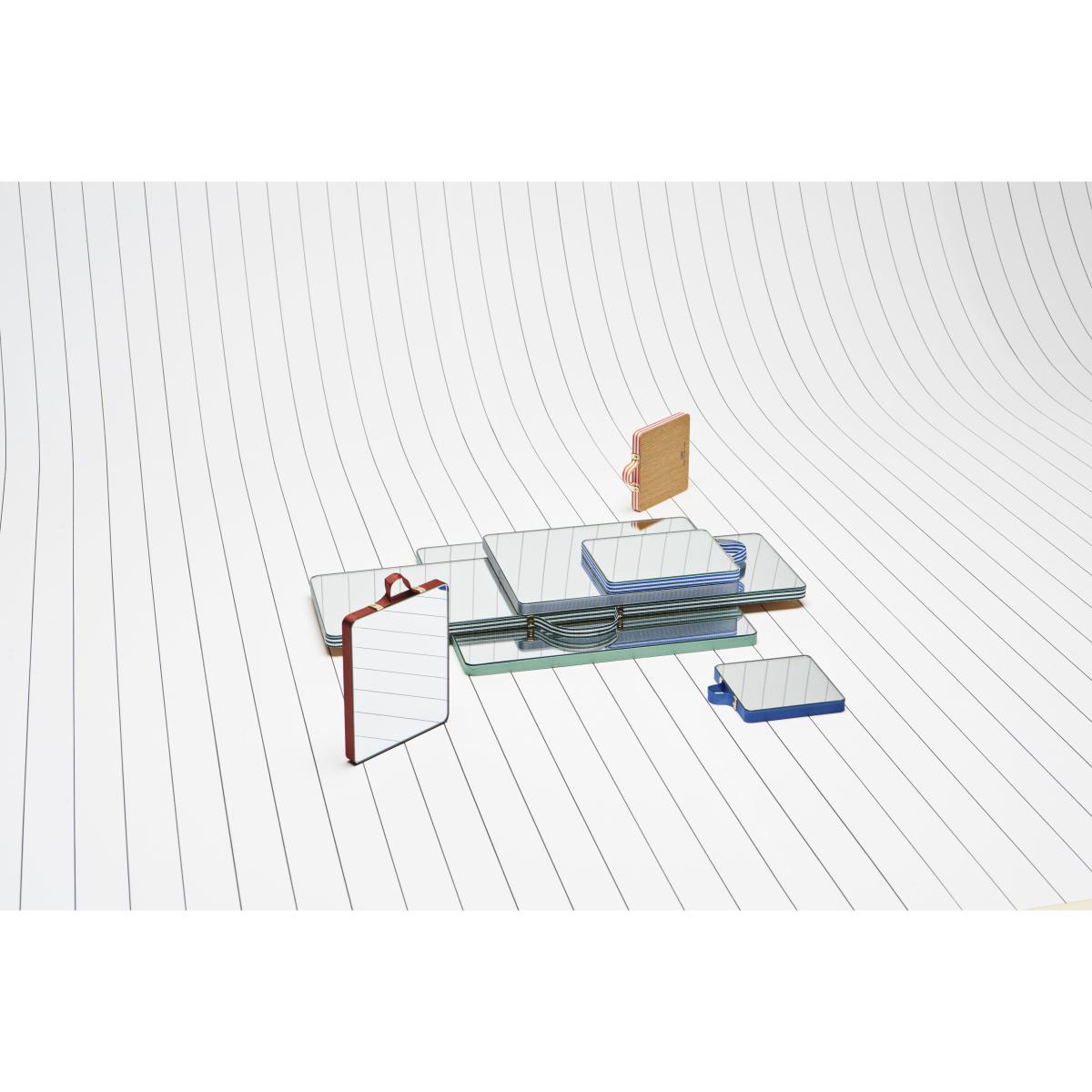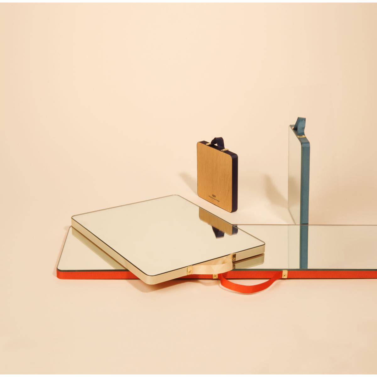 A simple fabric ribbon surrounds the mirror and sets it a side with a buckle to allow you to hang it on a brass hook (included). The idea of the designer, Inga Sempé to frame a mirror with a ribbon seems simple. In reality, a long refinement process was required in order to keep a light and graphical effect. Each element had to be modified several times: the kind of ribbon, its trajectory, its fastening, its fixing method on the edge, the fixing items, the material on which the glass is glued against. Everything so that it stays prettily simple and at an accessible price. The colourful polyester fabric ribbon surrounds the oak-clad frame. The buckle on top of the mirror is embellished with two pretty brass rivets. The Ruban collection includes 5 mirrors with different sizes and colours. They are designed to be bought separately or presented all together. The small square is like a little lighting point designed to illuminate a wall rather than to view yourself. The small rectangle appears to be a child's mirror. The Italian rectangle evokes sailors, or the mirrors that furnished old trains. To this a large rectangle and a large square for everyday use is added.