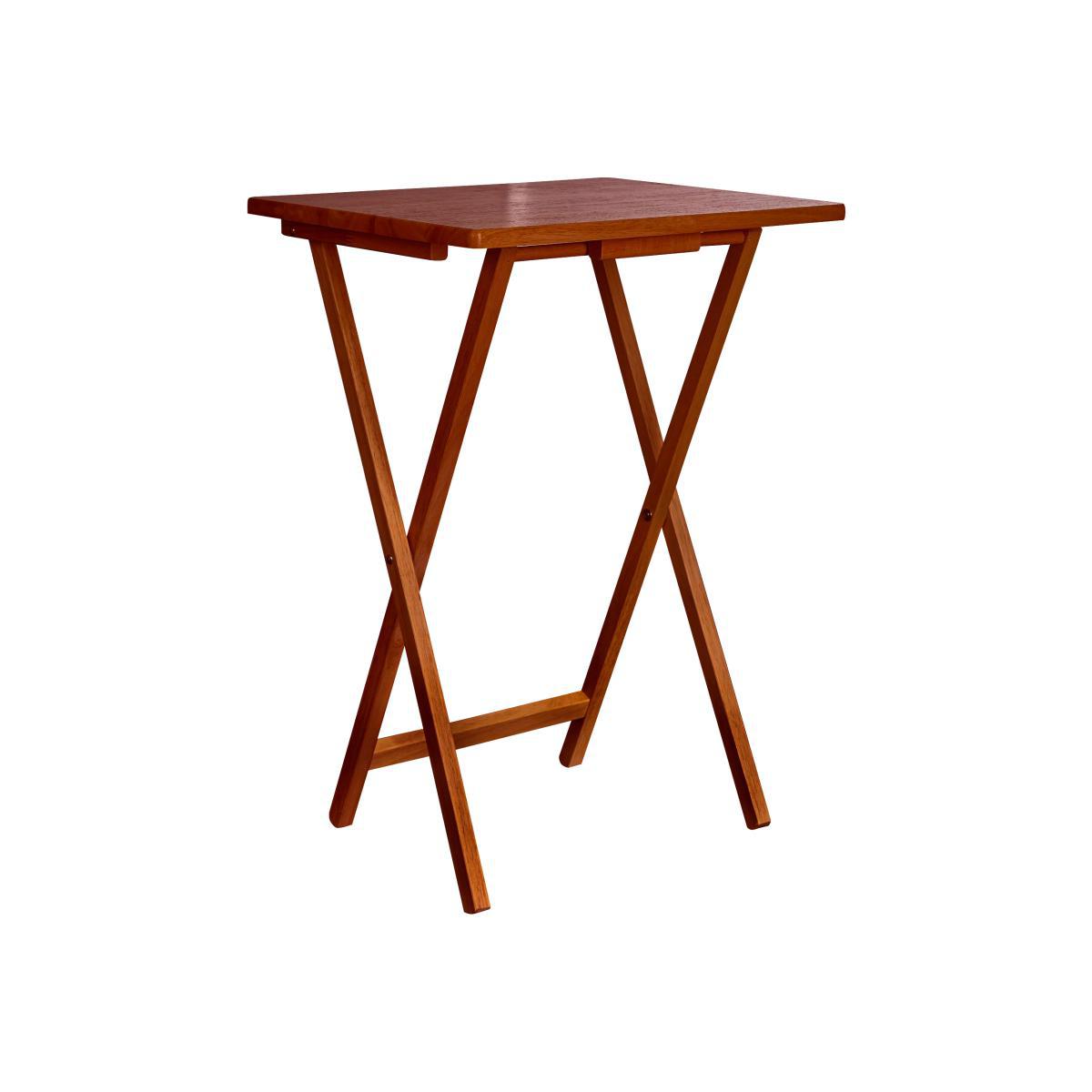 Designed with a dark wood finish and sturdy cross over legs, this collapsible TV table has been crafted from durable rubberwood and can easily fold away when not in use. Item fully assembled.