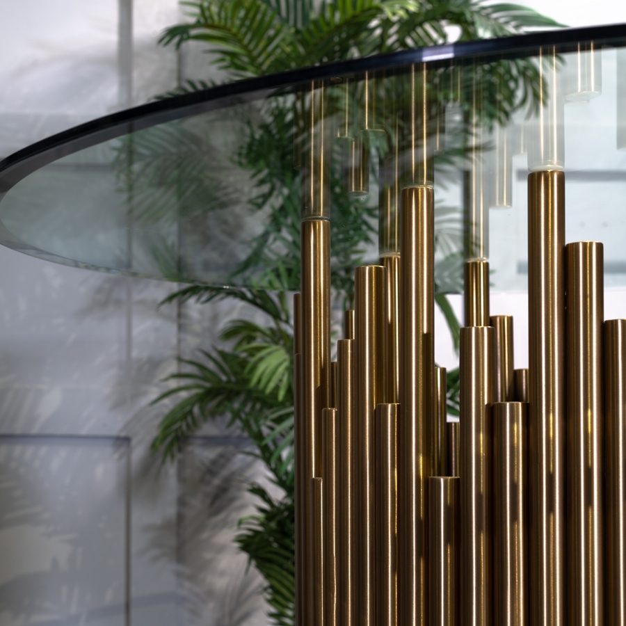 A striking, sculptural dining table inspired by 1920’s Art Deco furnishings and interiors. Comfortable seats 4-5 people. Brushed stainless steel base with brass electroplated finish. Toughen glass top with deep bevelled edge. Base supplied fully assembled.