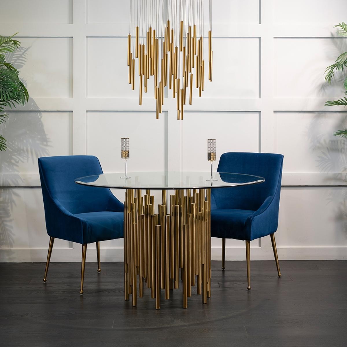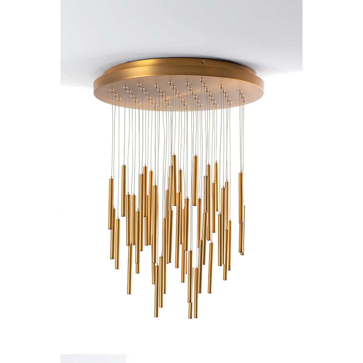 A striking, sculptural light fitting inspired by 1920’s Art Deco furnishings and interiors. Perfect for creating a focal point in dining areas. Brushed brass finish. Featuring two LED light sources - decorative droplet lights and ambient halo light. Remote control halo light with dim and glow functions. Height adjustable droplet lights.