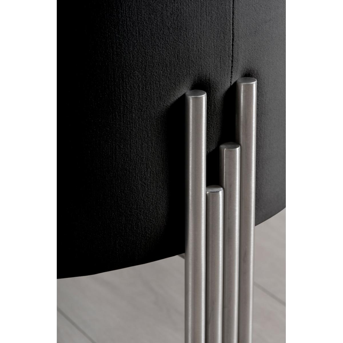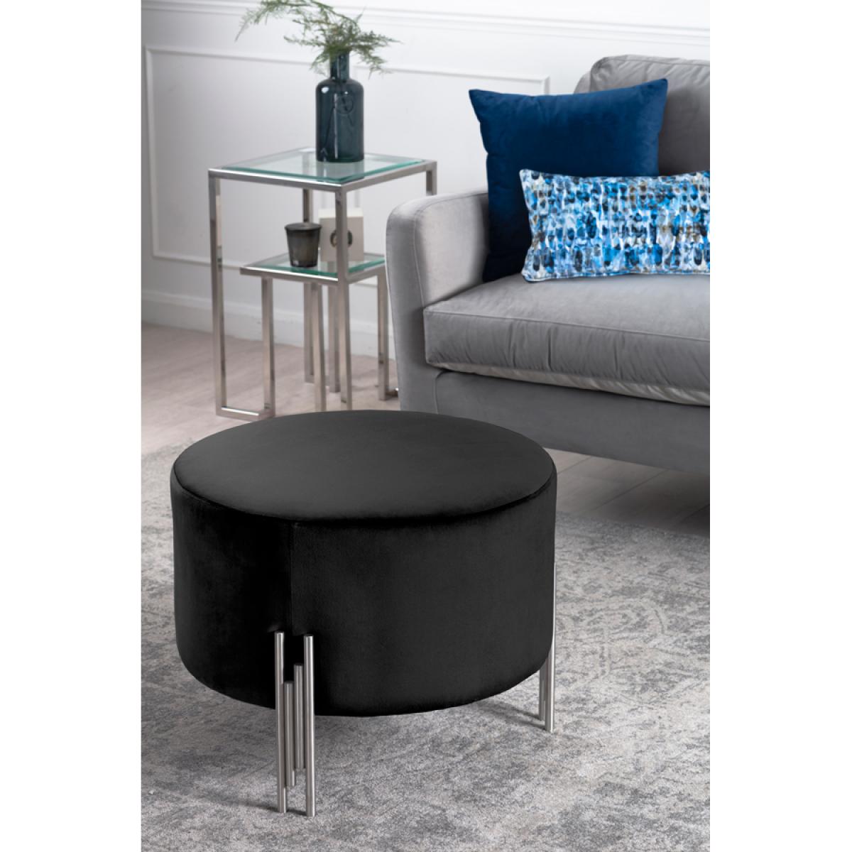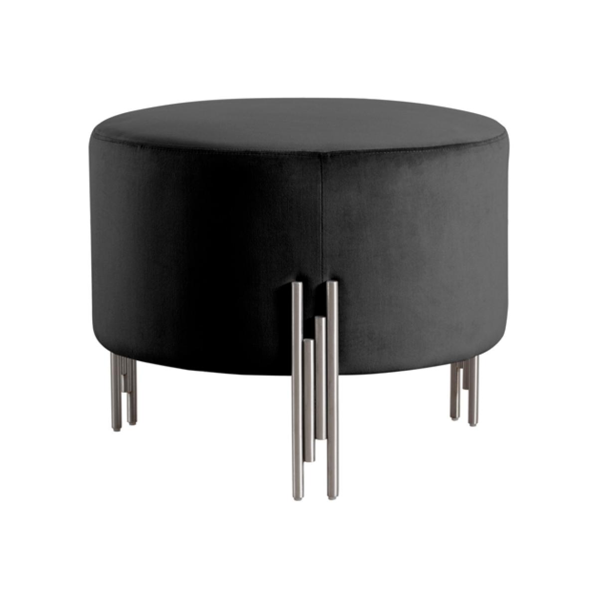 I really like the Rubell stool’s bold silhouette and luxurious feel, making it a versatile piece for both modern and contemporary interiors. The black upholstery paired with the silver base creates a striking contrast that can anchor a space, whether placed in a living room, bedroom, or dressing area. Its rounded shape offers a relaxed, inviting vibe, while its practicality makes it perfect as an additional seat or as a stylish side table. For styling tips, consider pairing it with layered textures and monochrome or metallic accents for a sophisticated look, or use it to add a sculptural touch in minimalist schemes. It works especially well in spaces that blend luxury with a clean aesthetic.
