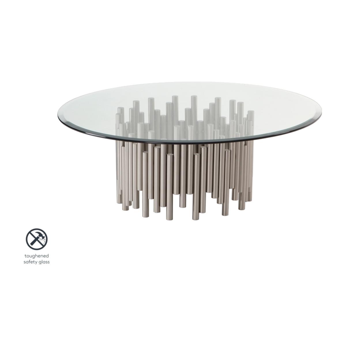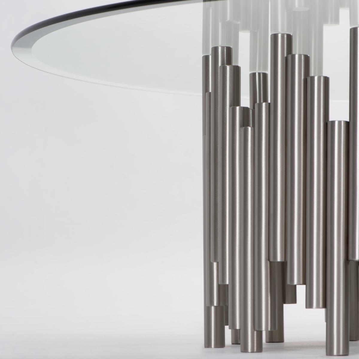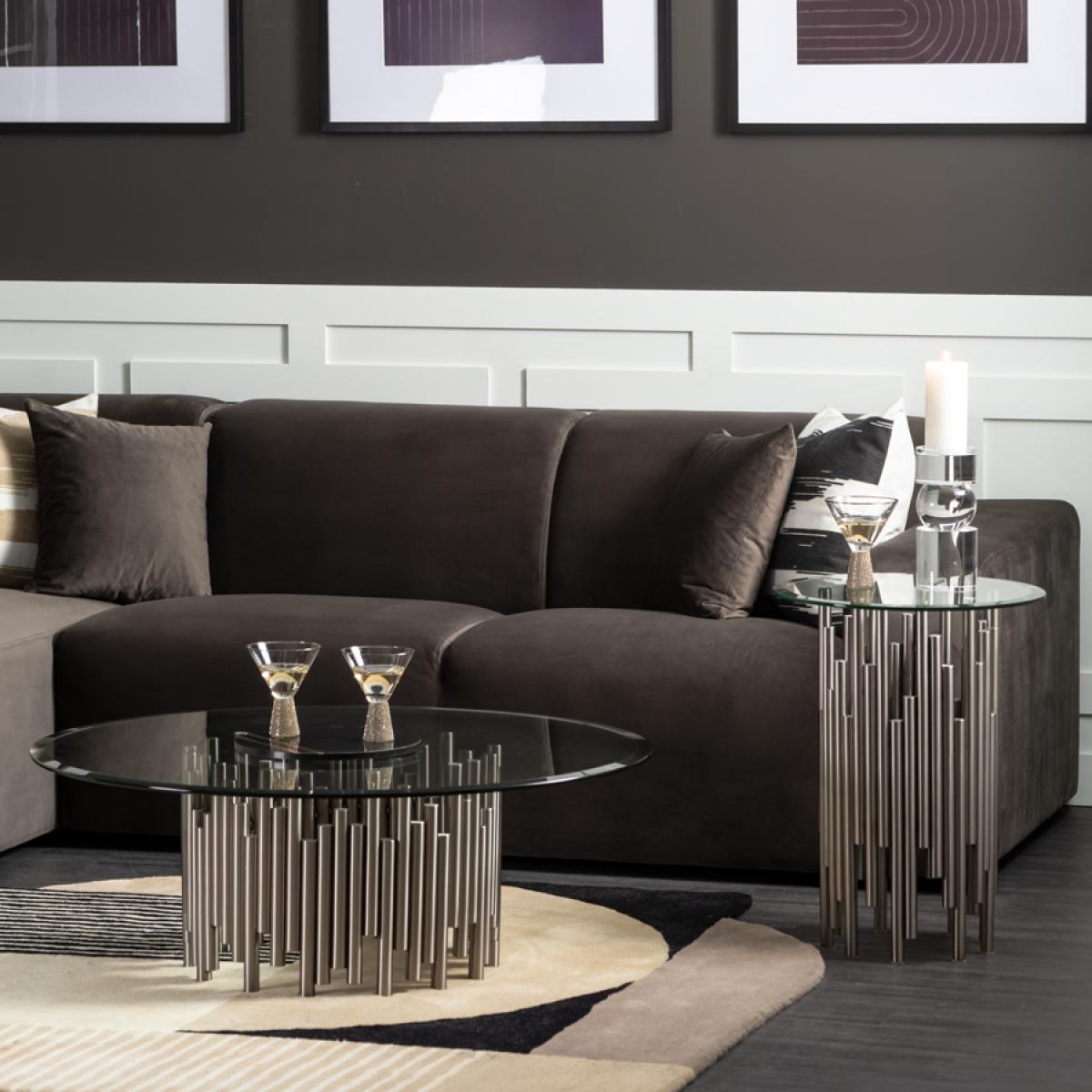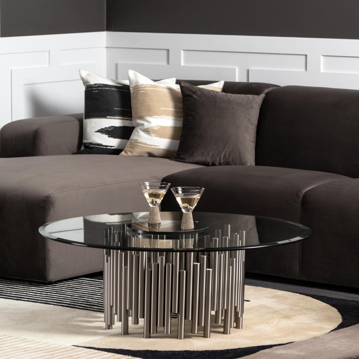 I love how the Rubell silver coffee table combines contemporary design with a strikingly sleek aesthetic. Its reflective glass top makes it versatile, working well in both modern minimal environments and more opulent interiors. The metallic base adds an industrial edge, but still feels glamorous, making it easy to style with layered textures and statement accessories. Practical tips include keeping the tabletop clear for a clean look or arranging a few sculptural pieces and a tray for an inviting centrepiece. It's particularly suited to open-plan living spaces where the reflective surface can add light and a sense of space, but works equally well in a statement lounge or a space with monochrome or neutral palettes.
