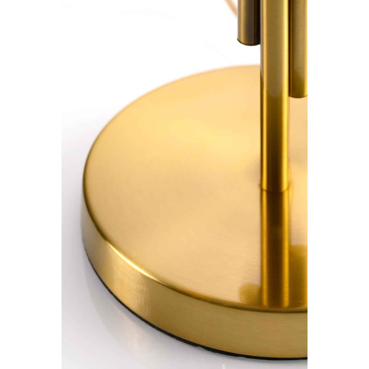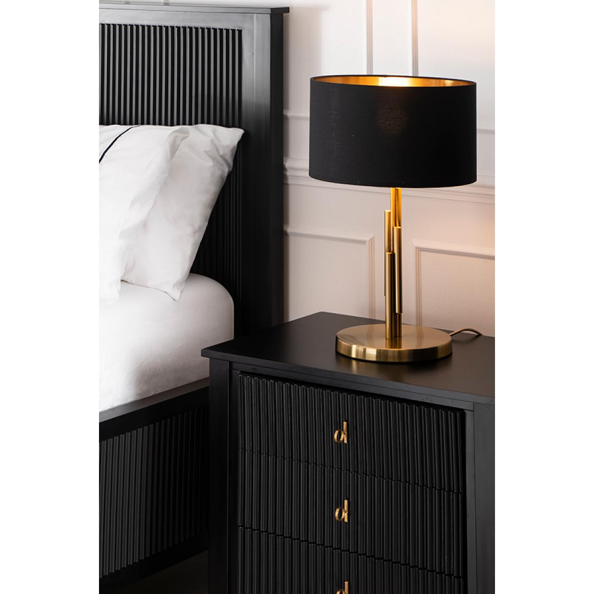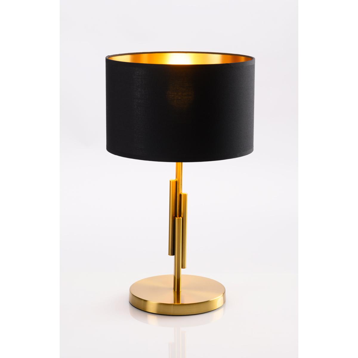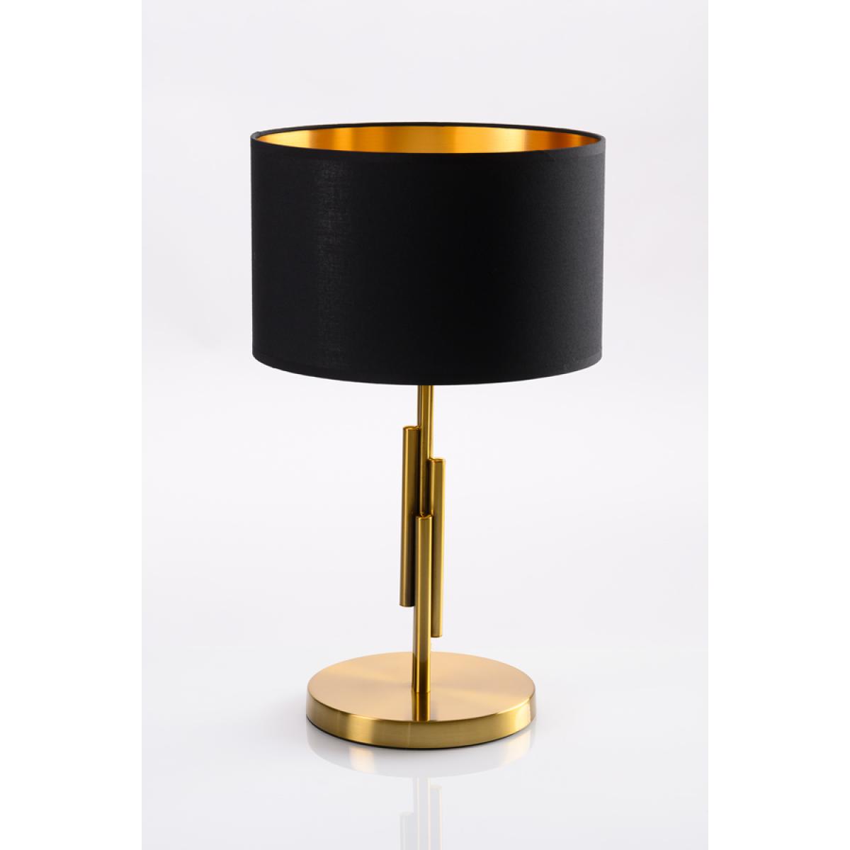 A sculptural table light inspired by 1920’s Art Deco furnishings and interiors Stainless steel with brushed brass finish Black polycotton shade with metallic reflective inner Perfect to display in pairs Supplied with 1 x E27 LED non dimmable bulb