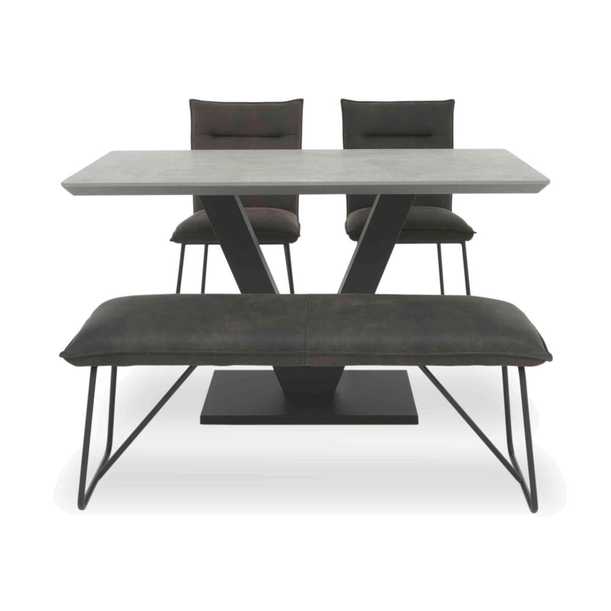 Bring home our Ruben range and you’ll enjoy dining room furniture that delivers cool contemporary style to even compact spaces. This collection brilliantly combines a bold design aesthetic with carefully considered ergonomic features. The dining table’s contemporary finishes also happen to be super-durable and family-friendly. Its metal V-shaped metal base makes it easy to seat more guests in comfort. And the wide choice of stylish mix and match dining chair and dining bench seating options makes it easy to create a dining space that works for you. Something else you’ll love? The incredible-value pricing. Online only at Furniture Village. With flexible versatile seating options – two dining chairs and a dining bench – this contemporary compact dining set is perfect for stylish family dining. It’s incredible value too. Why you'll love it On-trend contemporary dining style at a price you’ll love. This compact dining set is perfect for family spaces. Super-durable table top in a choice of stylish finishes. Top is scratch-resistant, chip-resistant, heat-resistant and easy to clean. Textured black metal V-shaped base is designed to save space. With 2 deeply comfortable dining chairs and a dining bench. Chairs and bench are cushioned with sprung foam. Soft suede-effect upholstery and cool metal ski legs. A Furniture Village online exclusive – you won’t find it in our stores. This dining set is part of our Ruben range. What you need to know Dining chairs and bench have metal frames and legs, and sprung foam cushioning. Dining bench seats 2. Dining table seats 6. Please note that the table top is not 100% heatproof. We recommend using coasters and placemats at all times.