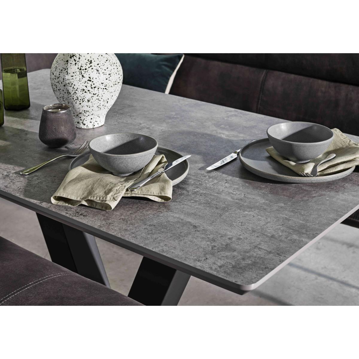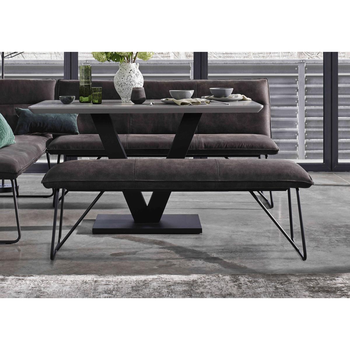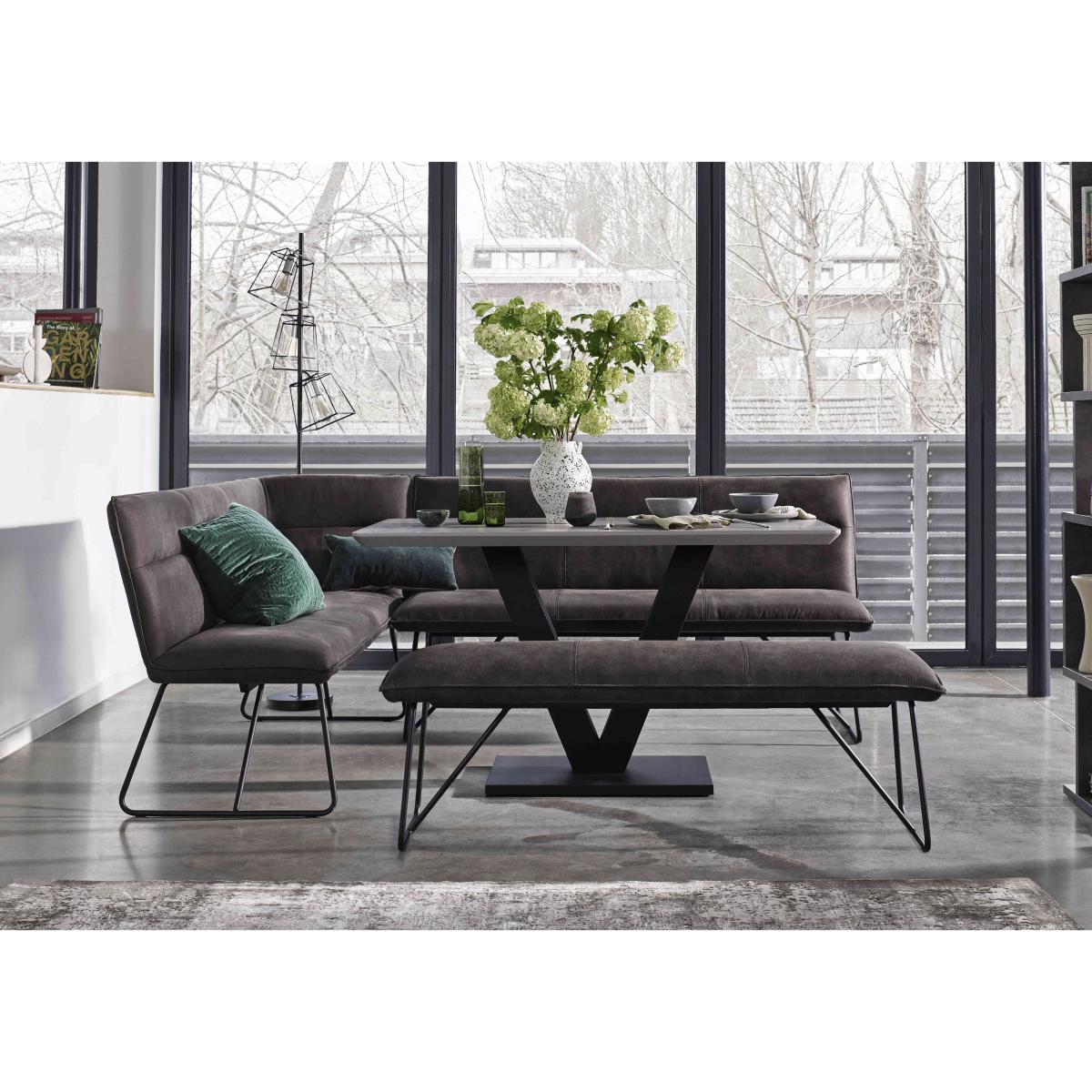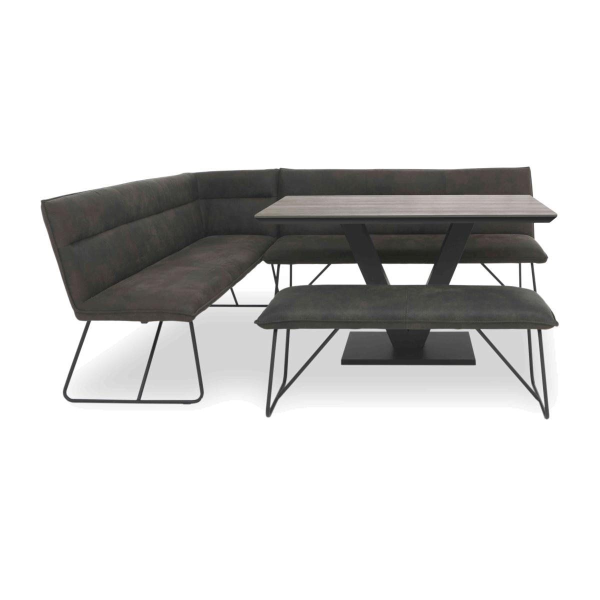 Bring home our Ruben range and you’ll enjoy dining room furniture that delivers cool contemporary style to even compact spaces. This collection brilliantly combines a bold design aesthetic with carefully considered ergonomic features. The dining table’s contemporary finishes also happen to be super-durable and family-friendly. Its metal V-shaped metal base makes it easy to seat more guests in comfort. And the wide choice of stylish mix and match dining chair and dining bench seating options makes it easy to create a dining space that works for you. Something else you’ll love? The incredible-value pricing. Online only at Furniture Village. Stock code: 9191HO4520. 1 <p>Please note: this clearance item has limited stock and is subject to availability.</p>You’ll love the versatile and stylish dining bench seating that comes with this dining set almost as much as the table’s super-tough contemporary finish. Great value too. Why you'll love it On-trend contemporary dining style at a price you’ll love. This compact dining set is perfect for family spaces. Super-durable table top in a choice of stylish finishes. Top is scratch-resistant, chip-resistant, heat-resistant and easy to clean. Textured black metal V-shaped base is designed to save space. With versatile and flexible dining bench seating. Benches are cushioned with sprung foam. Soft suede-effect upholstery and cool metal ski legs. The corner dining bench is composed of 2 separate pieces. It’s left-hand facing – the bench with the corner is on the left. A Furniture Village online exclusive – you won’t find it in our stores. This dining set is part of our Ruben range. What you need to know Dining chairs and bench have metal frames and legs, and sprung foam cushioning. Standard dining bench seats 2. Corner dining bench seats 4. Dining table seats 6. Please note that the table top is not 100% heatproof. We recommend using coasters and placemats at all times.