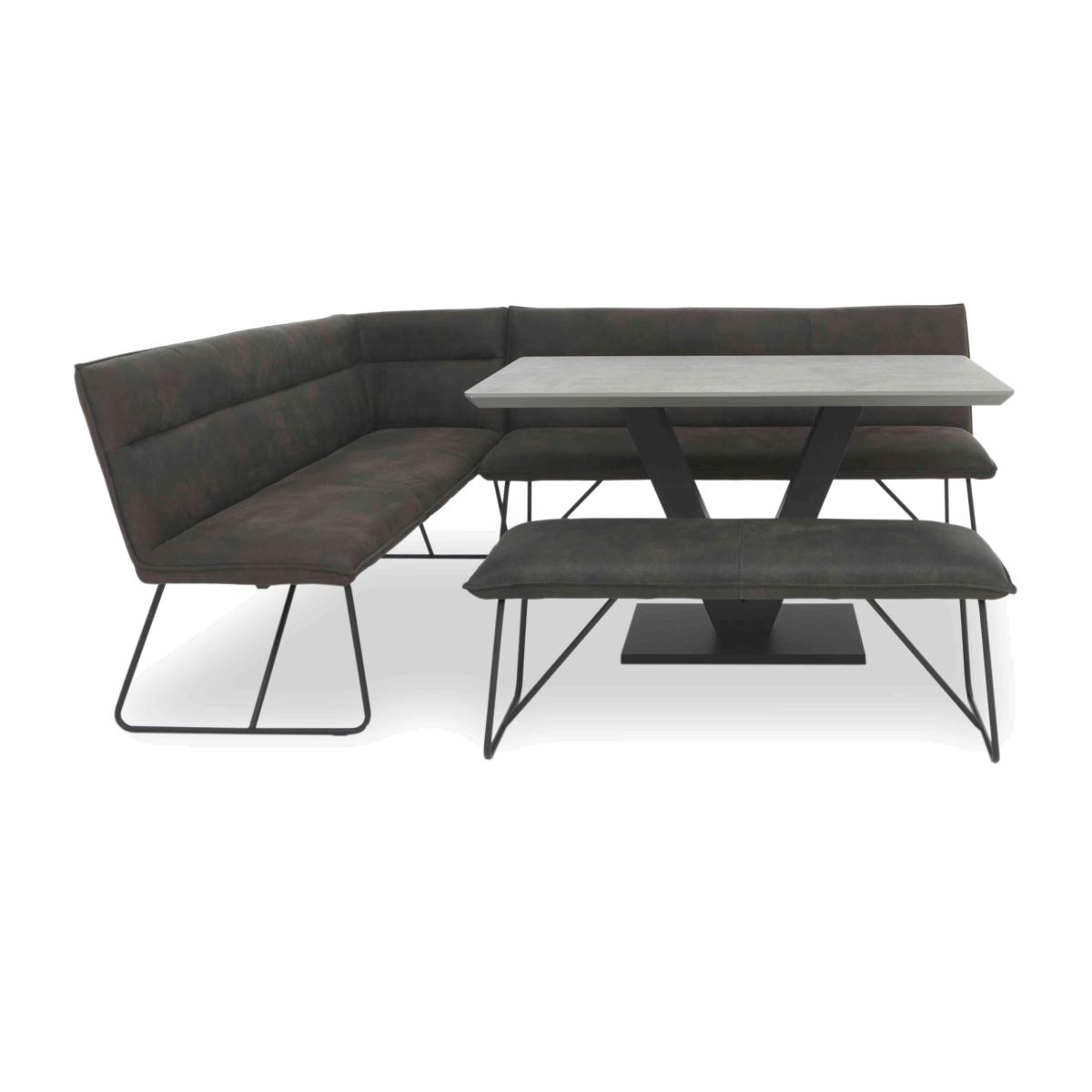 Bring home our Ruben range and you’ll enjoy dining room furniture that delivers cool contemporary style to even compact spaces. This collection brilliantly combines a bold design aesthetic with carefully considered ergonomic features. The dining table’s contemporary finishes also happen to be super-durable and family-friendly. Its metal V-shaped metal base makes it easy to seat more guests in comfort. And the wide choice of stylish mix and match dining chair and dining bench seating options makes it easy to create a dining space that works for you. Something else you’ll love? The incredible-value pricing. Online only at Furniture Village. You’ll love the versatile and stylish dining bench seating that comes with this dining set almost as much as the table’s super-tough contemporary finish. Great value too. Why you'll love it On-trend contemporary dining style at a price you’ll love. This compact dining set is perfect for family spaces. Super-durable table top in a choice of stylish finishes. Top is scratch-resistant, chip-resistant, heat-resistant and easy to clean. Textured black metal V-shaped base is designed to save space. With versatile and flexible dining bench seating. Benches are cushioned with sprung foam. Soft suede-effect upholstery and cool metal ski legs. The corner dining bench is composed of 2 separate pieces. It’s left-hand facing – the bench with the corner is on the left. Also available with a right-hand facing corner bench. A Furniture Village online exclusive – you won’t find it in our stores. This dining set is part of our Ruben range. What you need to know Dining chairs and bench have metal frames and legs, and sprung foam cushioning. Standard dining bench seats 2. Corner dining bench seats 4. Dining table seats 6. Please note that the table top is not 100% heatproof. We recommend using coasters and placemats at all times.