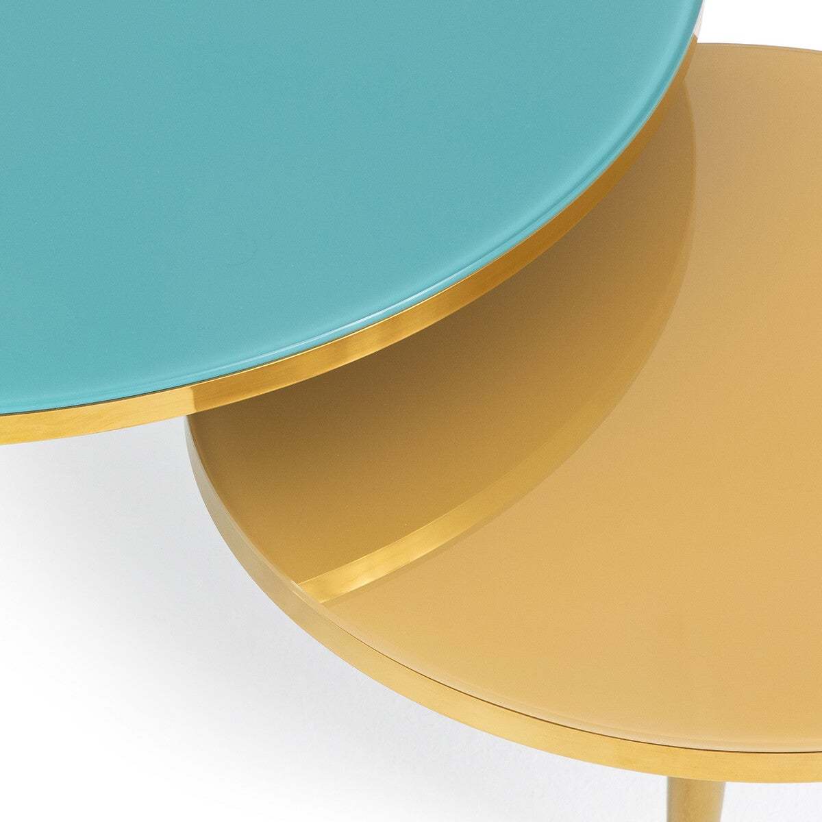 The Ruben triple coffee table in tempered glass. The unusual shape of this coffee table will leave you charmed. Three tabletops in differently coloured tempered glass give a futuristic yet vintage feel.