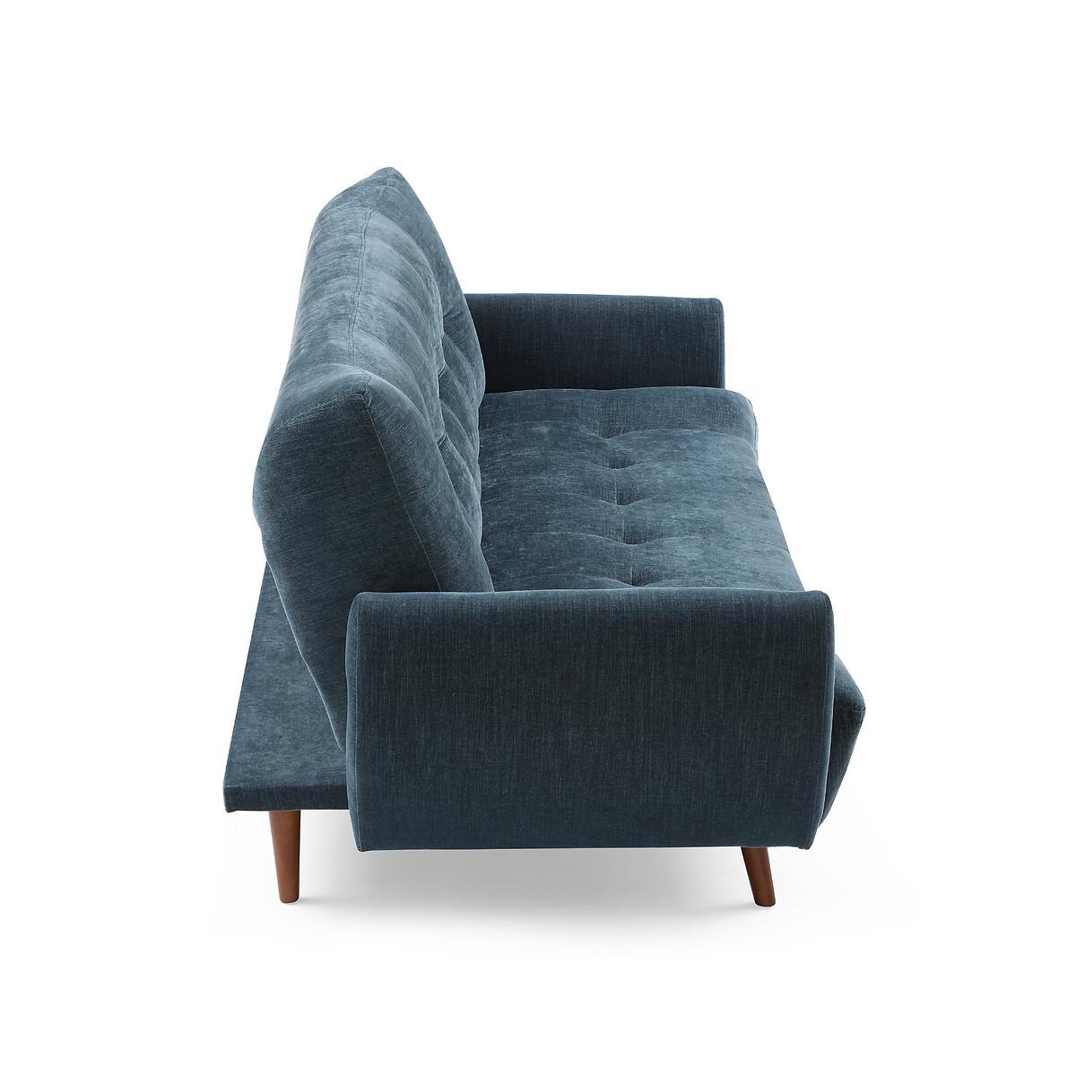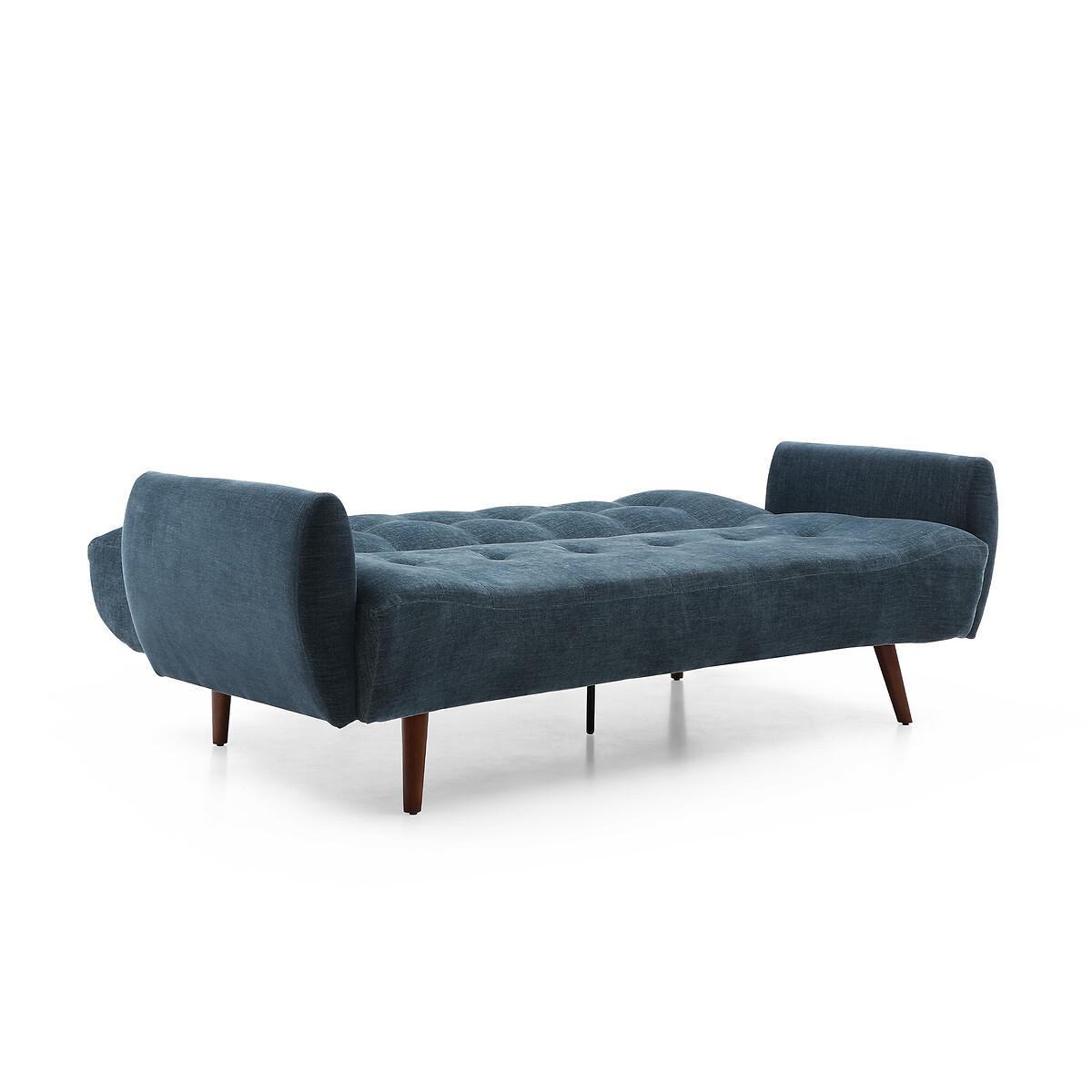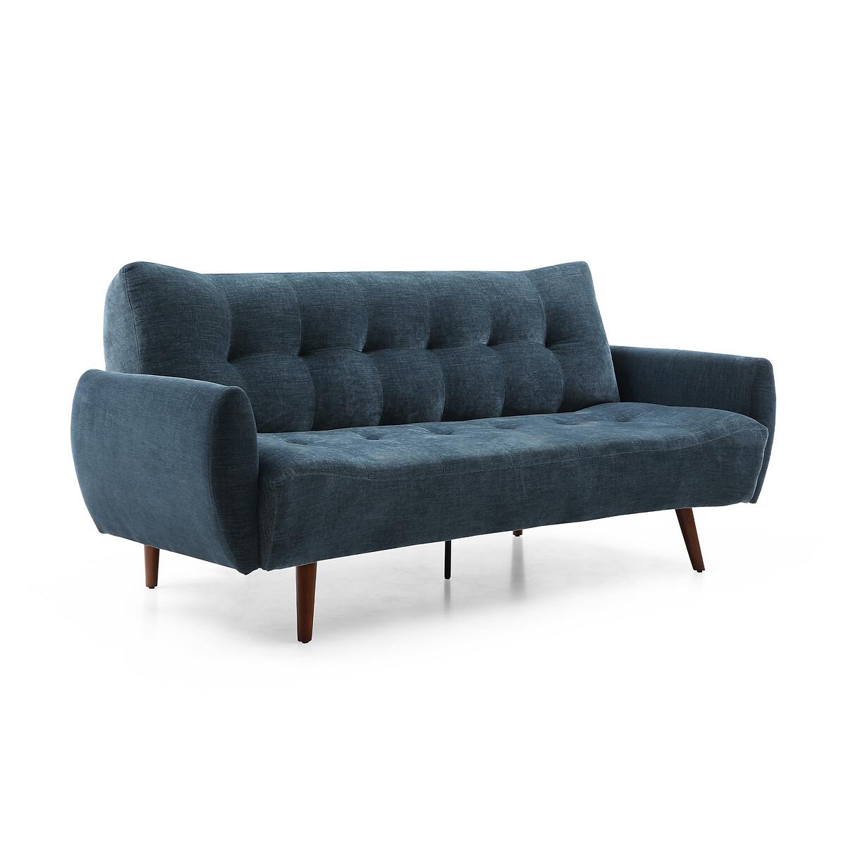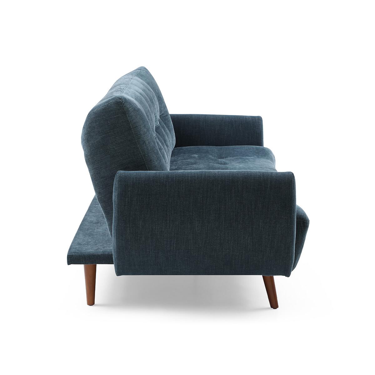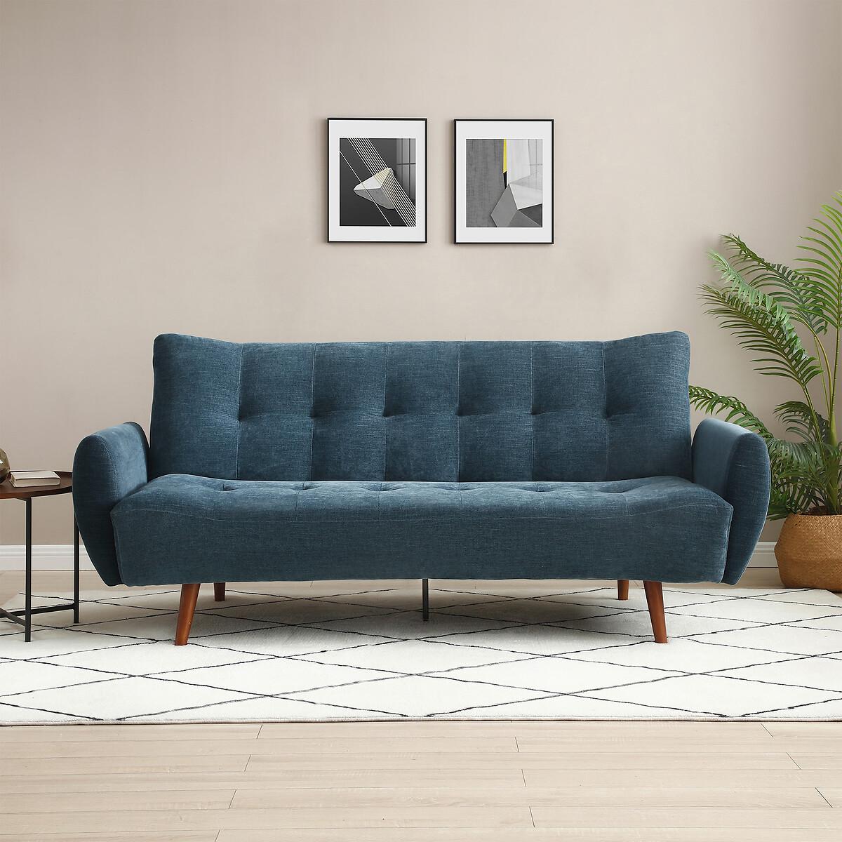 A stylish click clack sofa bed in a modern design, with dark wooden legs. Comfy foam & fibre seat and back cushions offer the perfect blend of support and softness. A versatile and functional addition to any room. Product Details • Upholstered in a chenille fabric with tufted button detail • Easy clean upholstery • Sprung seat with foam fillings • Soft stuffed fibre filed back cushions for that sink in feeling • Medium comfort level - the perfect balance of supportive yet soft • Walnut finished legs • Click clack opening mechanism • Converts into a bed suitable for two sleepers (156cm x 218cm) • 12 month manufacturers warranty • EUTR Compliant, BS5852 compliant • Assembly required (legs/feet only)Product Composition - Frame - Eucalyptus Fabric - 100% polyester chenille Seat fillings - foam on pocket spring Back filings - fibre. Product Dimensions - 102 cm x210 cm x93 cm , Weight - 52 KGSeat Height - 46 cm. Seat Width - 189 cm. Seat Depth - 58 cm. Back Height - 46 cm Clearance to floor - 18 cm. Arm Height - 68 cm Package Dimensions - 191 cm x 125 cm x 29 cm, Weight 56 kg. This product will be dispatched by one of our trusted suppliers. You’ll be contacted by their selected courier about your delivery. Please note: this product cannot be delivered to all Offshore Islands, Northern Ireland or Republic of Ireland.