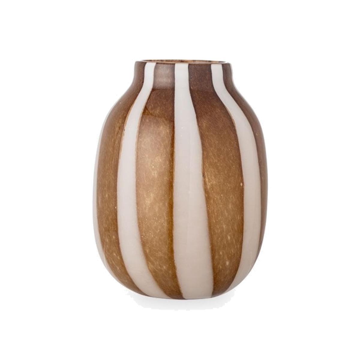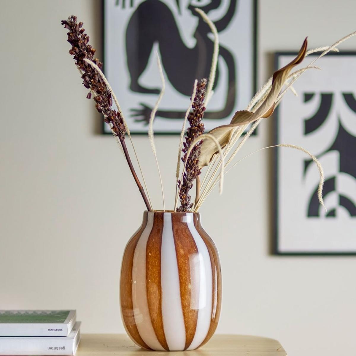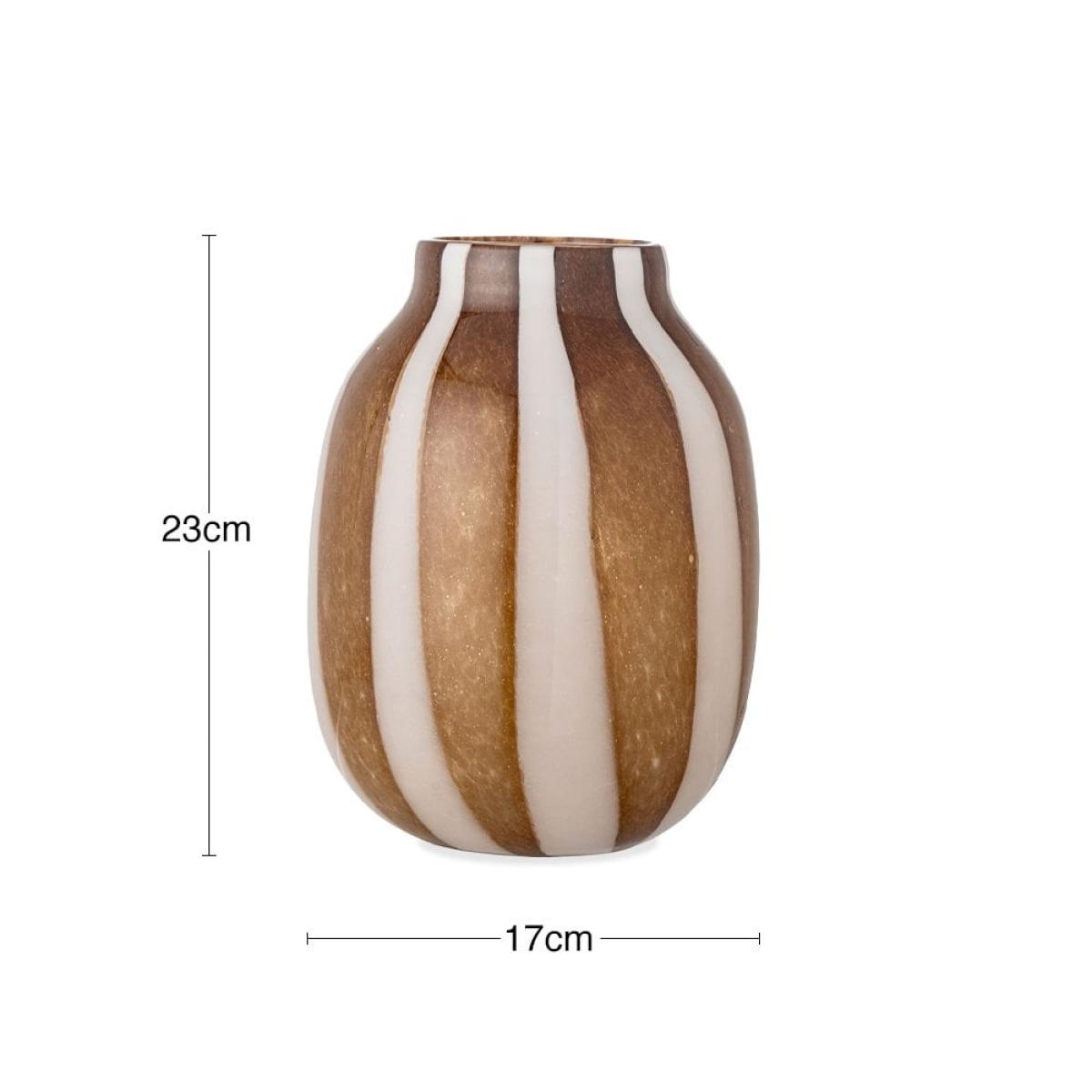 The perfect combination of vintage and contemporary, featuring light brown and taupe stripes on a sophisticated round glass shape. This vase has an alluring shine and is sure to catch the attention of the guests while adding a touch of elegance to your home. Please note: This is a mouthblown vase which makes each piece unique to you. There may be small variations in size, shape, and colour.