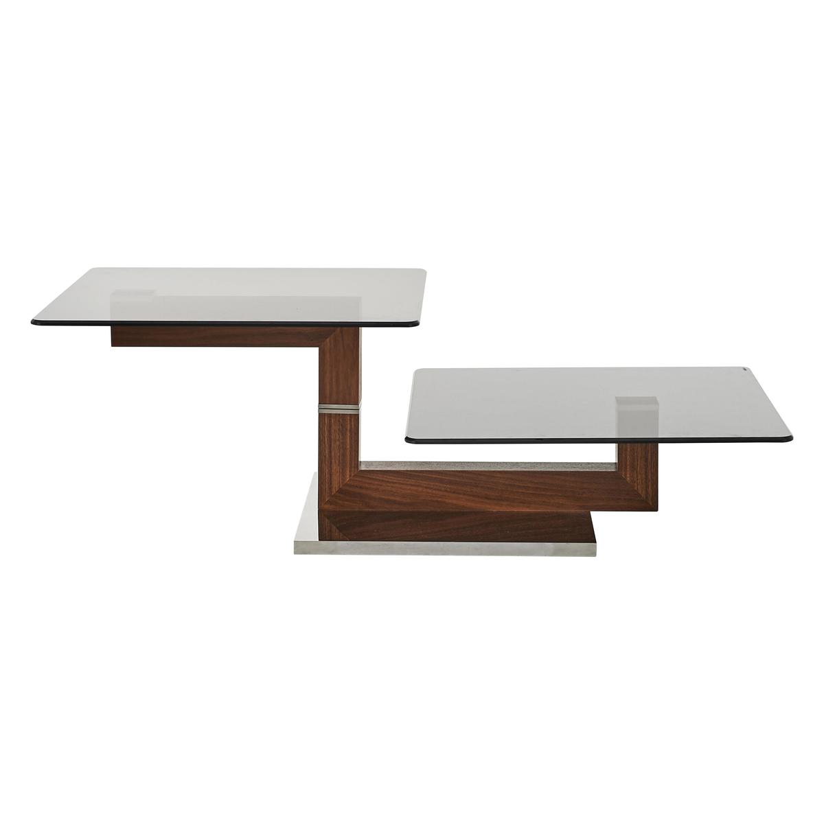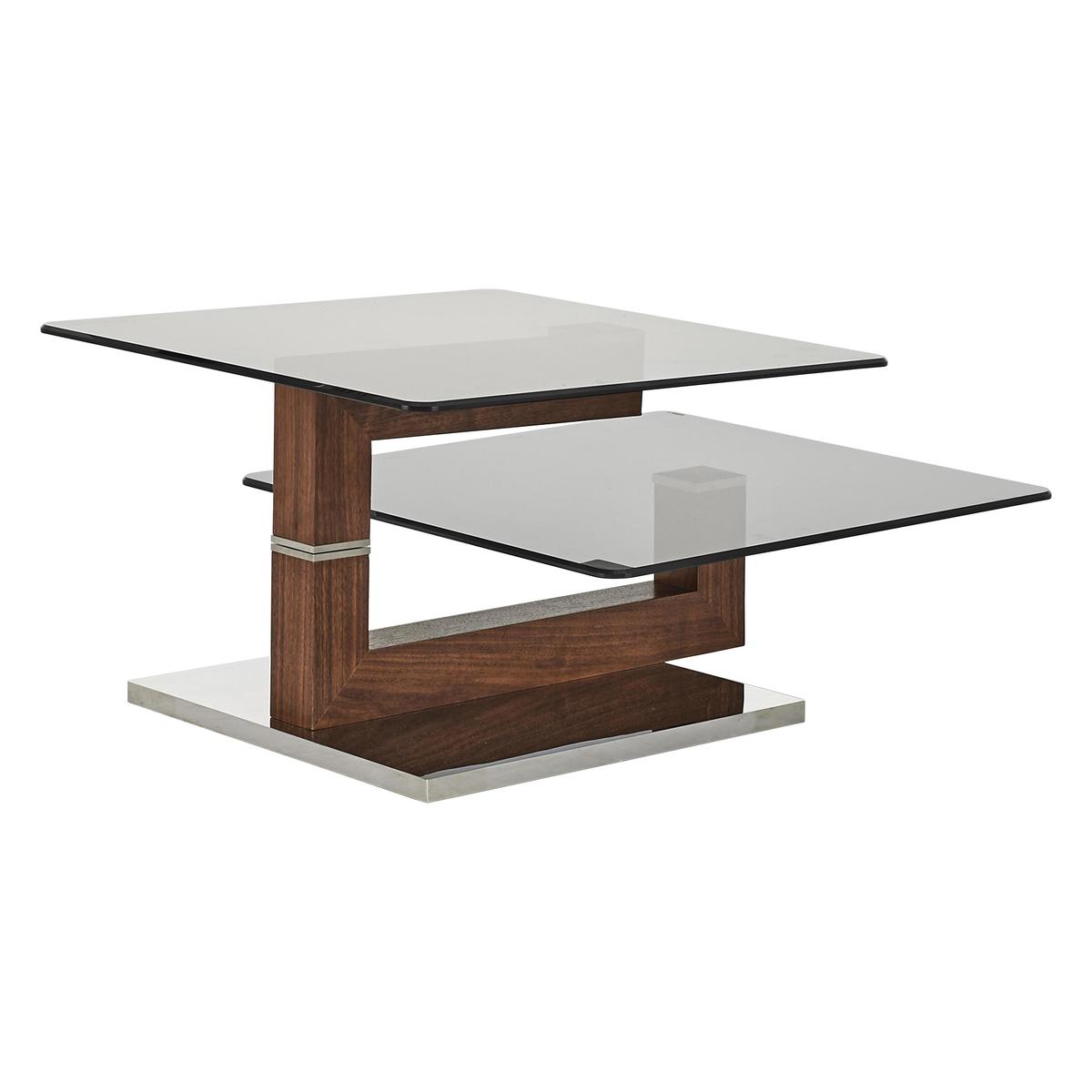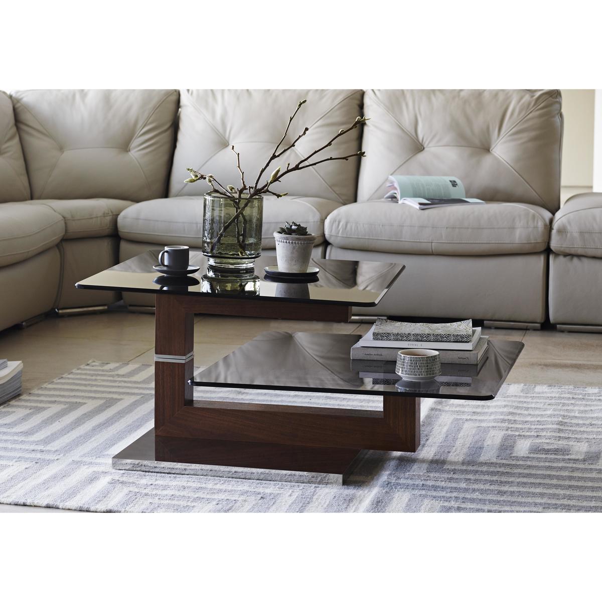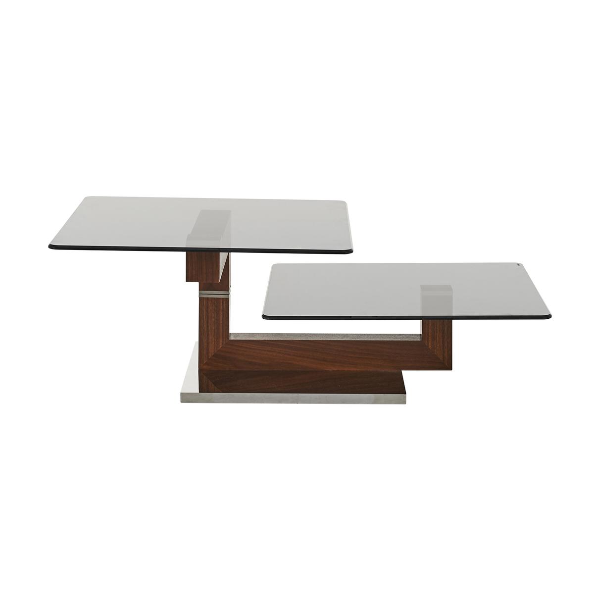 Contemporary extending coffee table. A clever engineered arm swivels the top level outwards to extend the table. Stainless steel base. Real wood veneer supports. Smoked 10mm tempered glass top