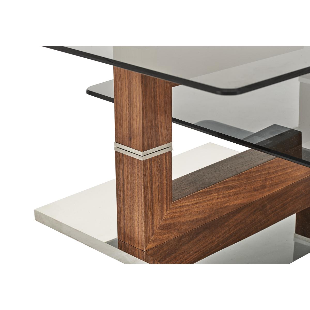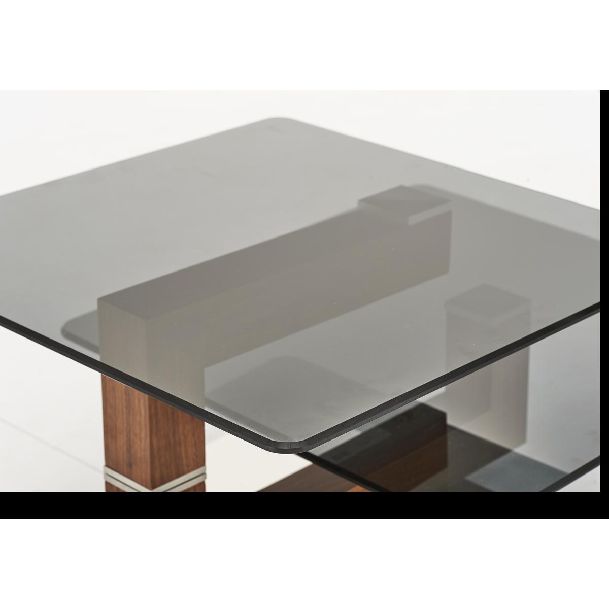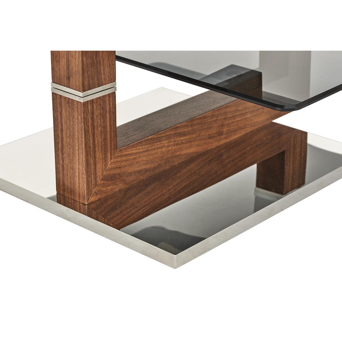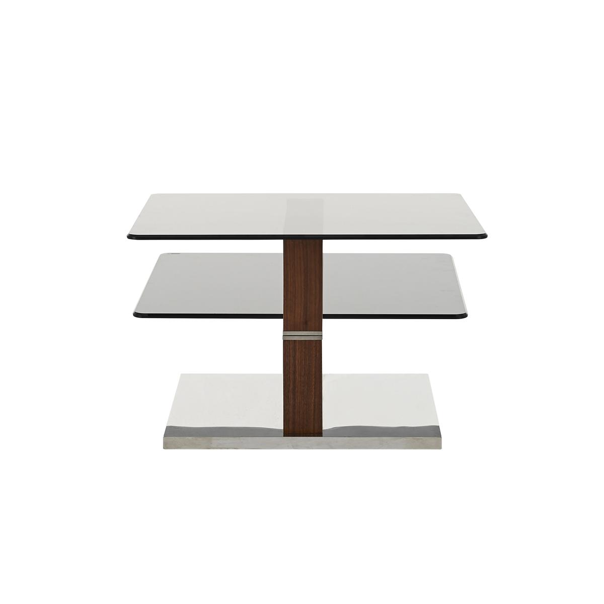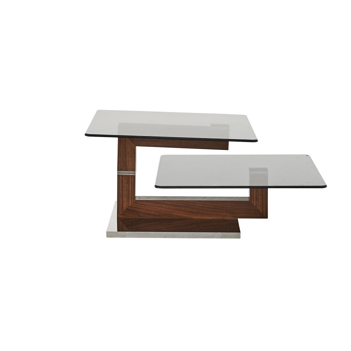 Contemporary extending coffee table. A clever engineered arm swivels the top level outwards to extend the table. Stainless steel base. Real wood veneer supports. Smoked 10mm tempered glass top
