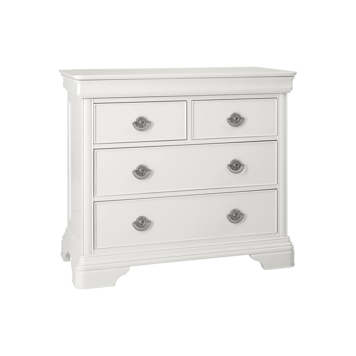 Timeless white painted chest of drawers in the French style, with soft close drawers and a strong white matt lacquer finish. With a corniced top and silver finish drawer handles. Why you’ll love it. Timeless elegance never goes out of fashion. Classic white painted French style. Plenty of storage in two deep lower and two small upper drawers. Smooth, soft-close drawer runners. Corniced top, exquisite shield-shaped silver finish drawer handles. Traditional pedestal feet. Crafted from solid American poplar wood. Finished with an easy-to-clean white matt lacquer. What you need to know. Made from solid American poplar wood and veneer. Finished in a durable white matt lacquer. Part of the Ruby White bedroom range, including chests of drawers, wardrobes and a dressing table. WARNING!. Furniture can tip over unexpectedly and cause injury. This item shall be fixed to a wall using the anti-tip kit provided with the furniture. Be sure to use the correct wall fixings suitable for the walls in your home.