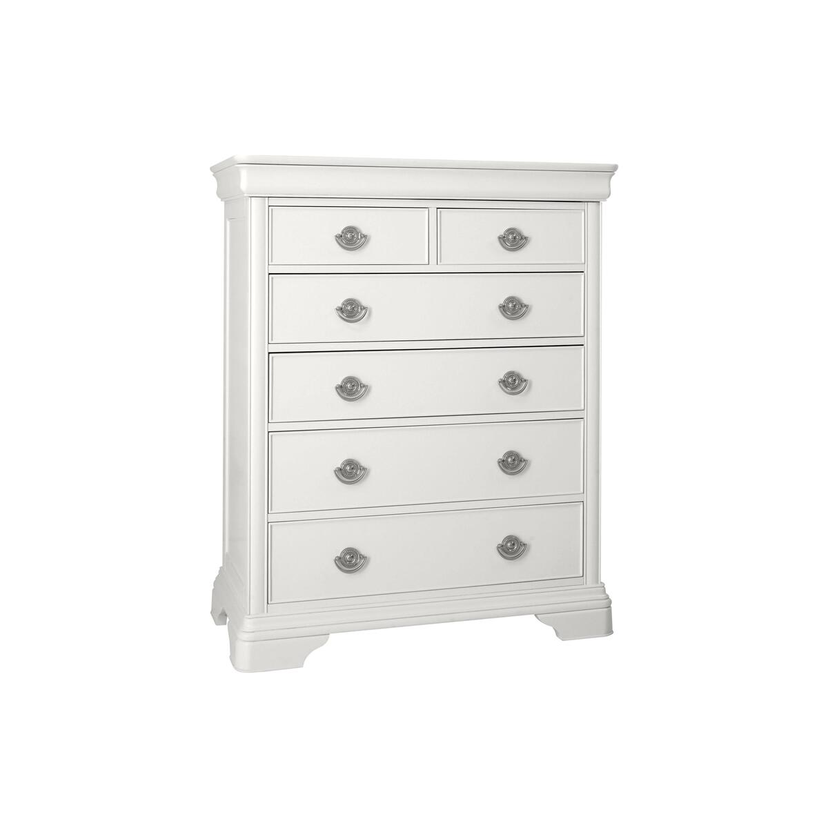 Classic white painted chest of drawers inspired by French style, with soft close drawers and a strong white matt lacquer finish. With beautiful silvered drawer handles. Why youll love it Timeless elegance never goes out of fashion. Classic white painted French style. Lots of storage in four spacious lower and two smaller upper drawers. Smooth, soft- close drawer runners. Corniced top, exquisite shield- shaped silver finish drawer handles. Traditional pedestal feet. Crafted from solid American poplar wood. Finished with an easy- to- clean white matt lacquer. What you need to know Made from solid American poplar wood and veneer. Finished in a durable white matt lacquer. Part of the Ruby White bedroom range, including chests of drawers, wardrobes and a dressing table. WARNING! Furniture can tip over unexpectedly and cause injury. This item must be fixed to a wall using the anti- tip kit provided. Be sure to use the correct wall fixings suitable for the walls in your home. Furniture Village is not able to fix anti- tip devices for you. Seek professional advice if you are unsure.
