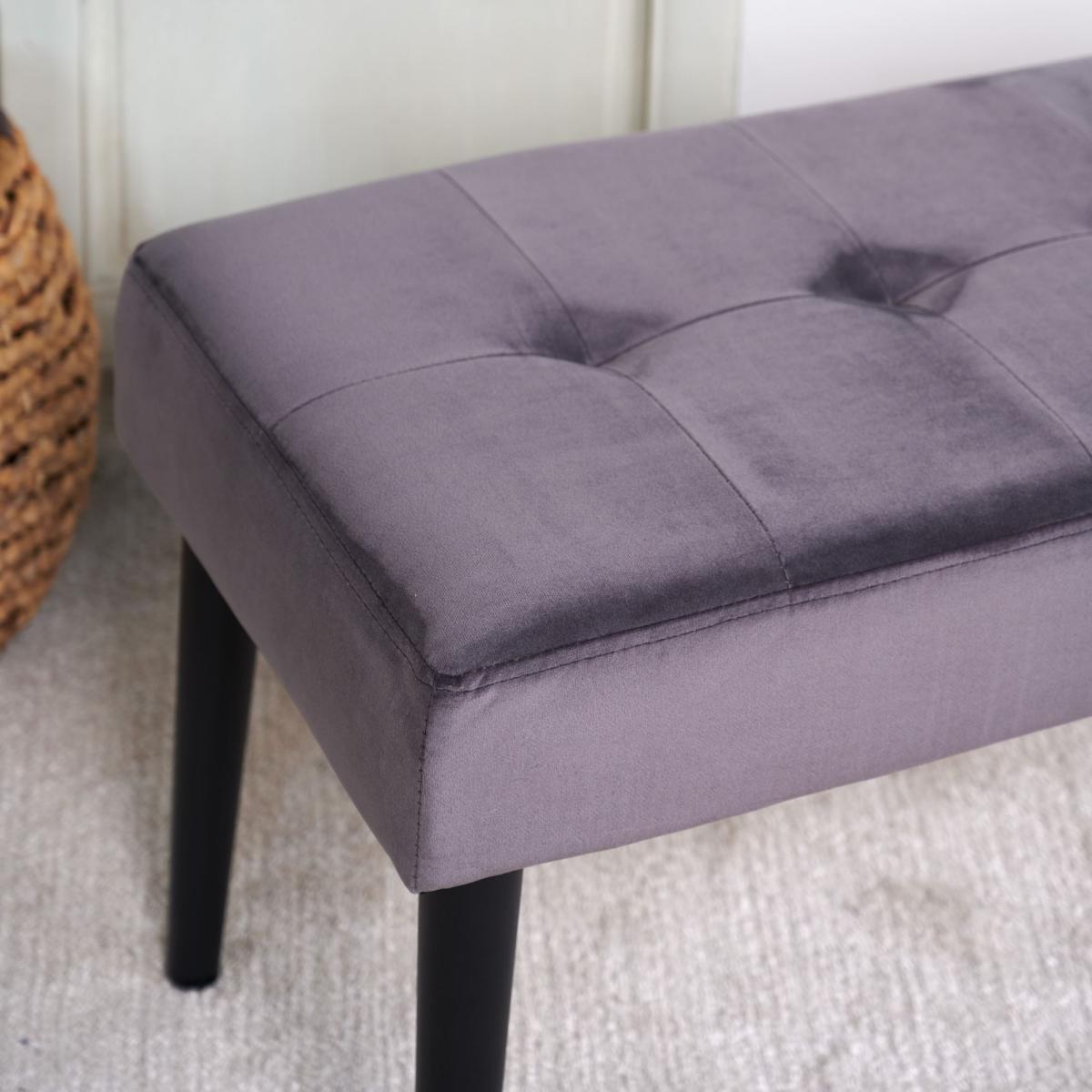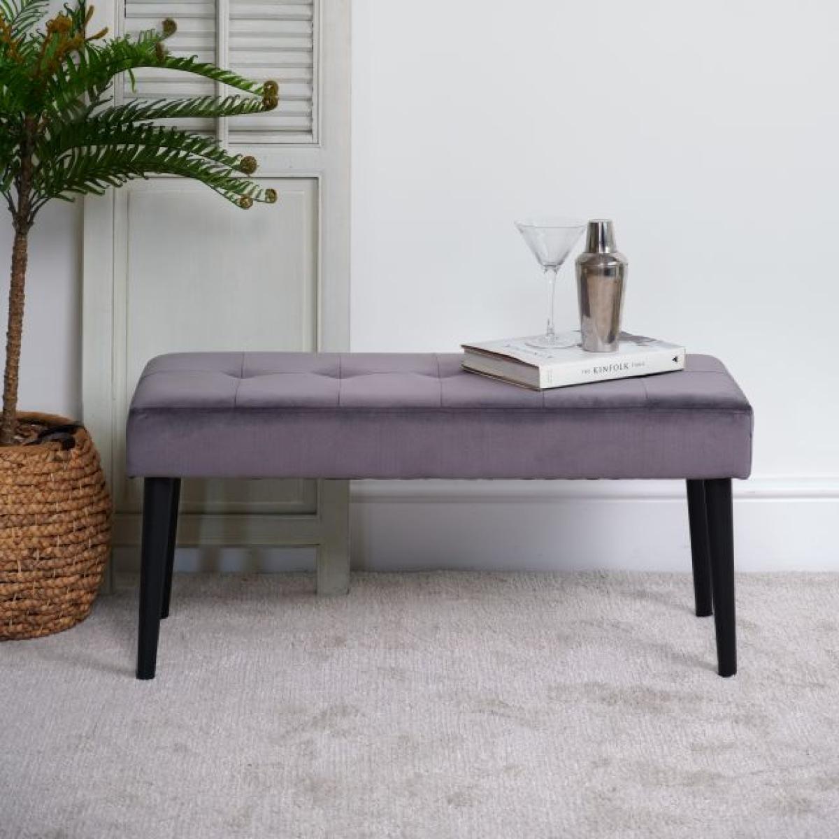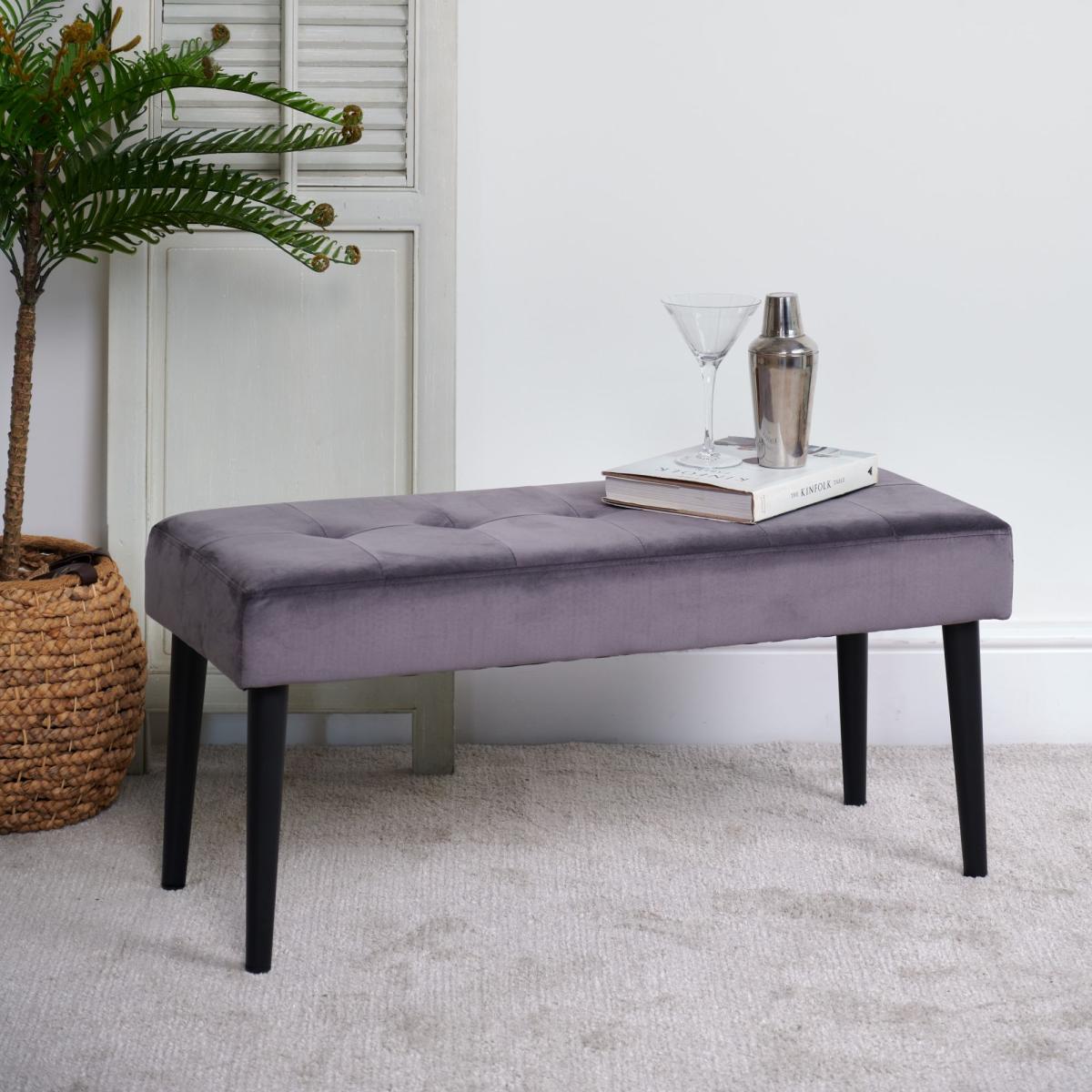 This gorgeous grey velvet bench seat is perfect for additional seating in the sitting room or dining room. Perhaps under a window or in an alcove. Dressed in a soft grey velvet, with piping along the edges and buttoned detail on the top, the Ruby benches are a real joy in the home. Also available in green, blue, mustard and copper.