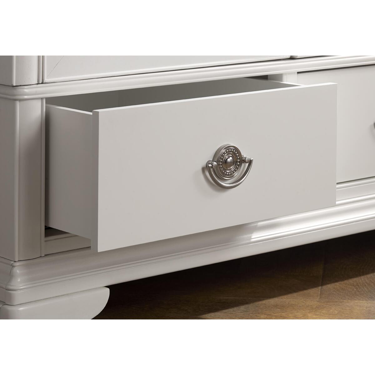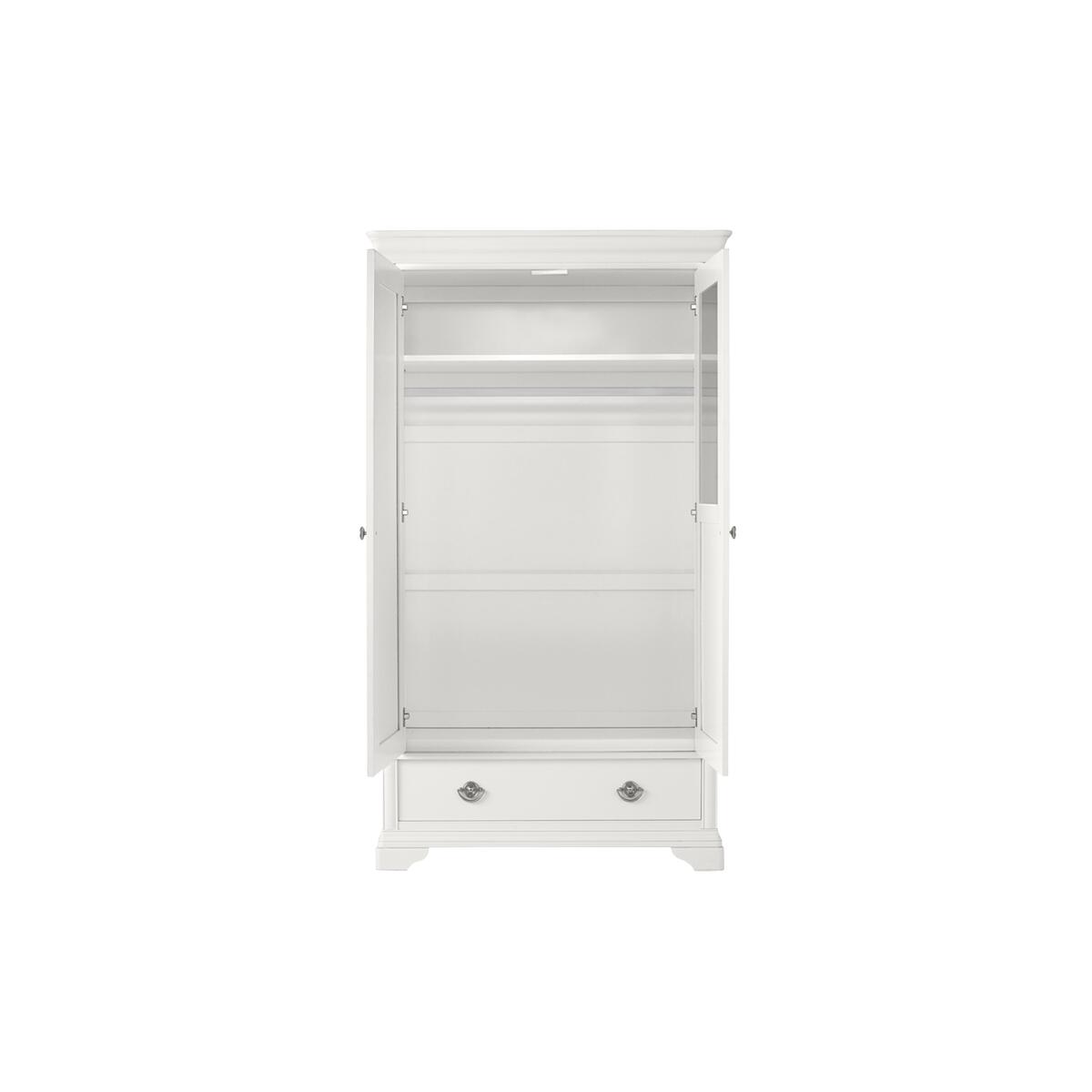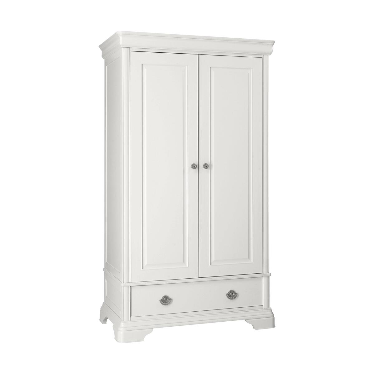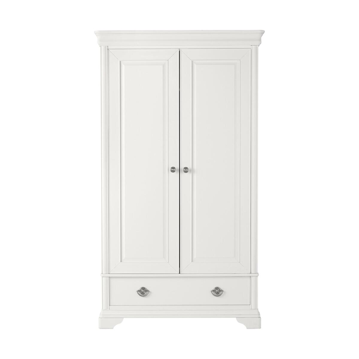 Large and roomy double wardrobe with that French painted look but with a very practical strong white matt lacquer finish. Detailing includes a corniced top and pedestal feet. Why you’ll love it. Timeless elegance never goes out of fashion. Classic white painted French style. Spacious storage includes a large, deep drawer below. With a smooth, soft-close drawer runner. Corniced top, round silver finish door handles. Exquisite shield-shaped silver finish drawer handles. Traditional pedestal feet. Crafted from solid American poplar wood. Finished with an easy-to-clean white matt lacquer. What you need to know. Made from solid American poplar wood and veneer. Finished in a durable white matt lacquer. Wardrobe section has a hanging rail and a removable shelf. Assembled for you on delivery. Part of the Ruby White bedroom range, including chests of drawers, a bed frame and a dressing table. WARNING!. Furniture can tip over unexpectedly and cause injury. This item shall be fixed to a wall using the anti-tip kit provided with the furniture. Be sure to use the correct wall fixings suitable for the walls in your home.