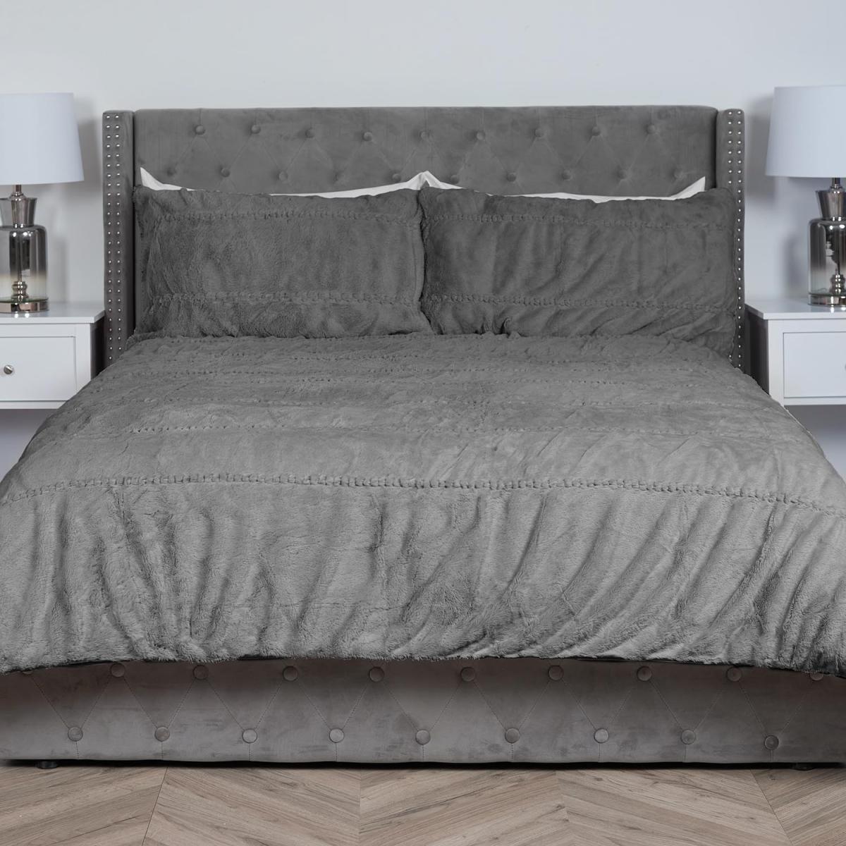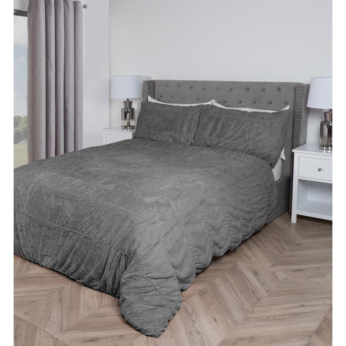 Ruched Faux Fur Duvet and Pillow Case Set - Grey / Superking