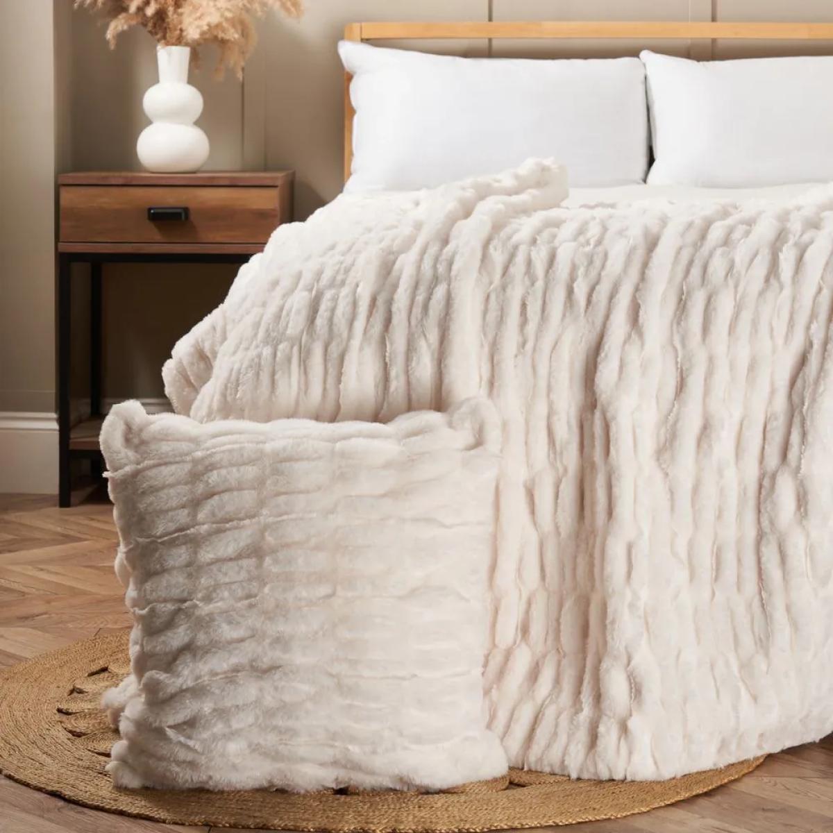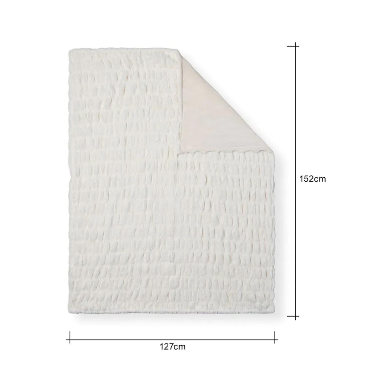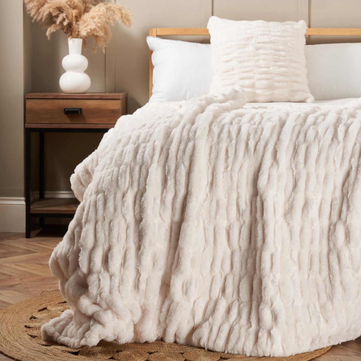 Transform your living space with the Ruched Faux Fur Throw in Cream, perfect for styling across beds or sofas to create a soft, inviting look. Its generous 127x152cm size makes it ideal for layering, adding both comfort and visual interest to your decor. The creamy tone brightens interiors beautifully, while the ruched texture introduces a touch of luxury.