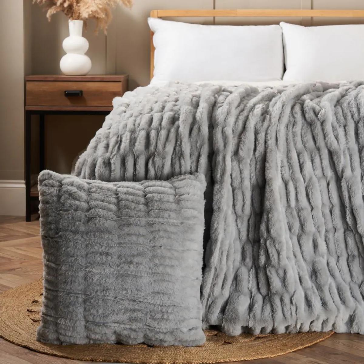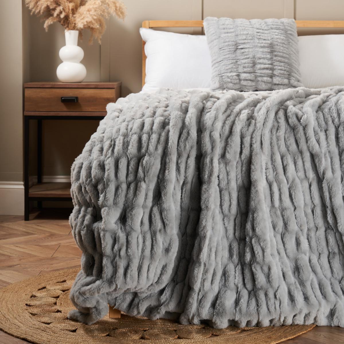 Ruched Faux Fur Throw, Grey
