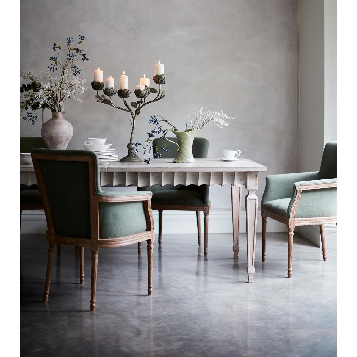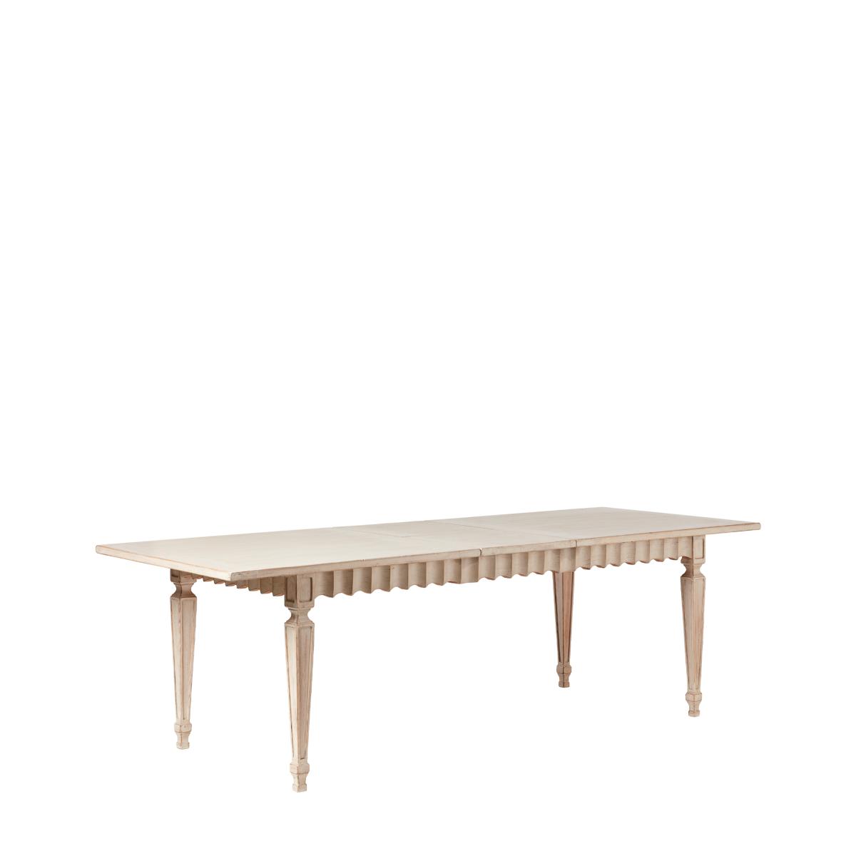 Seeking frills? Make space in your scheme for our antique Gustavian-inspired Ruffelen pieces. The collection comprises two dining tables (one extendable, one oval) and a matching console table – all of which are hand-painted a period-appropriate pale grey-green hue. Seating six to eight people, the extendable dining table is perfect for large households, as well as those that love hosting. Noteworthy details include tapered legs, a ruffle trim and a tabletop that opens to fit additional leaves.