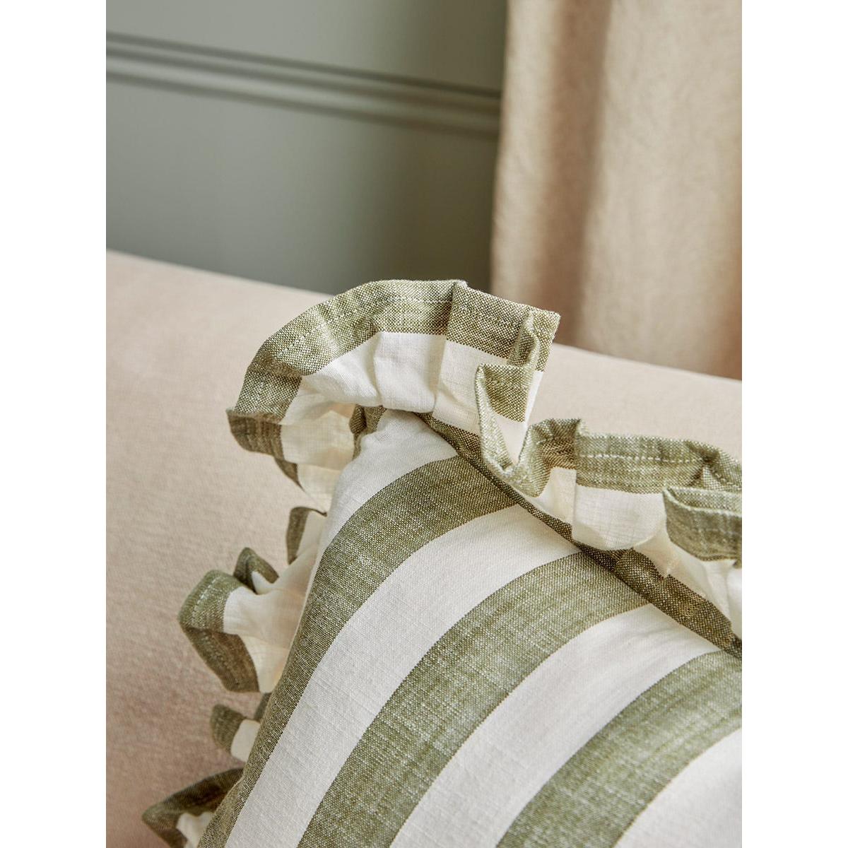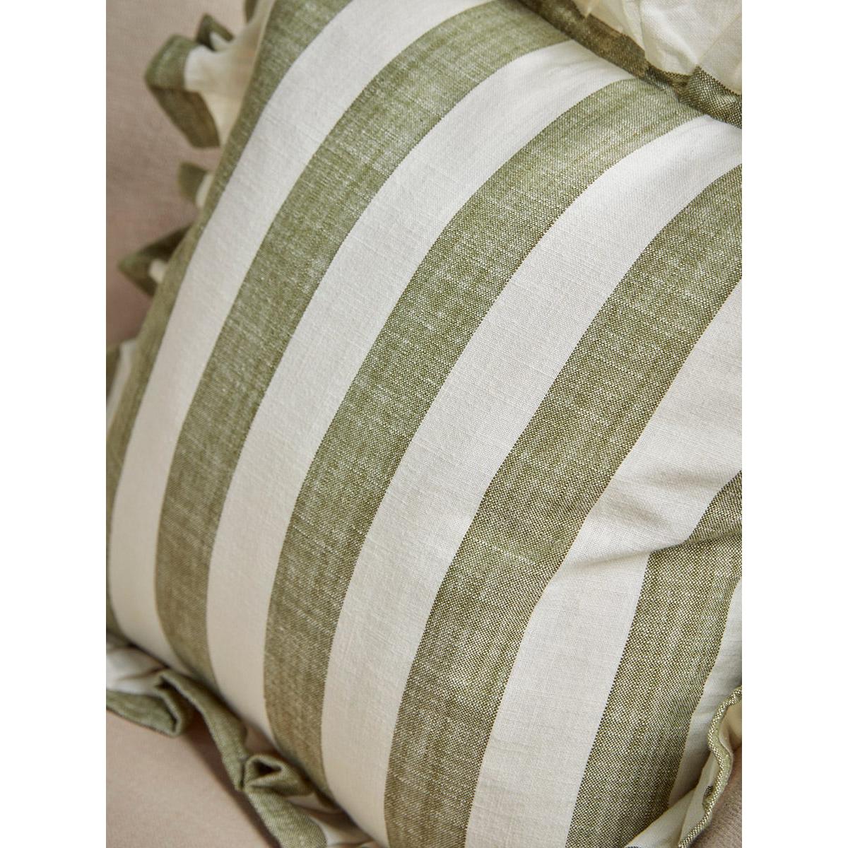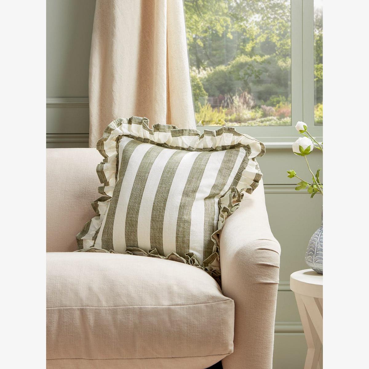 Timeless stripes in a beautiful sage green tone grace this pillow - perfect for a space that invites natural and neutral tones - for a cute and quaint design to add to your sofa, armchair or bed for a cosy and heart warming finish. With a delicate ruffle detailing, this cushion is sure to add charm and a lovely cottage feel to invigorate your space. Also available in blue.