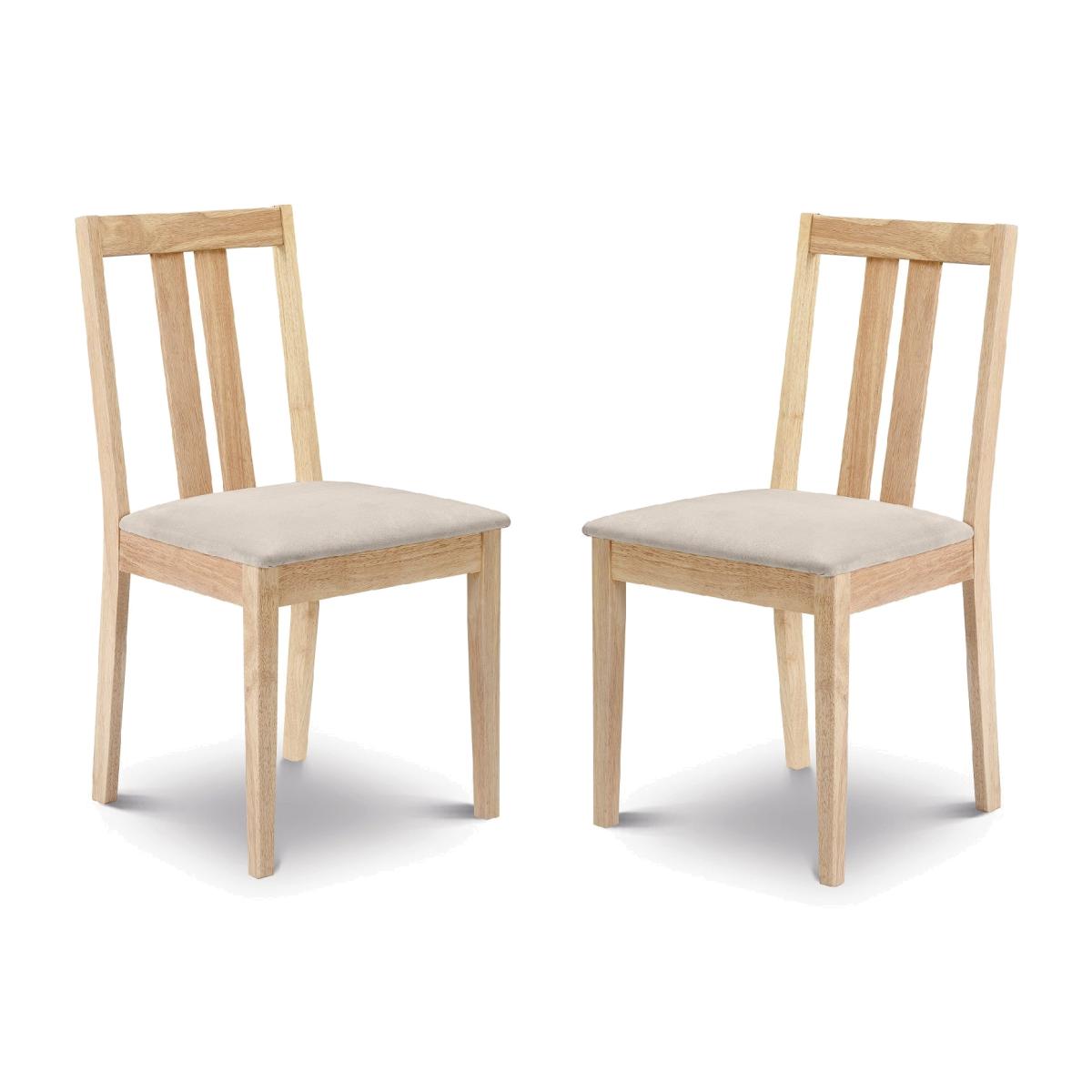 * 2 x Dining chairs* Faux suede seat pad* Hardwood frame Crafted from hardwood and finished with a faux suede seat pad, these chairs offer durability and style. The simple yet sophisticated design makes them a versatile addition to any dining space, while the neutral color palette complements a variety of decor styles.