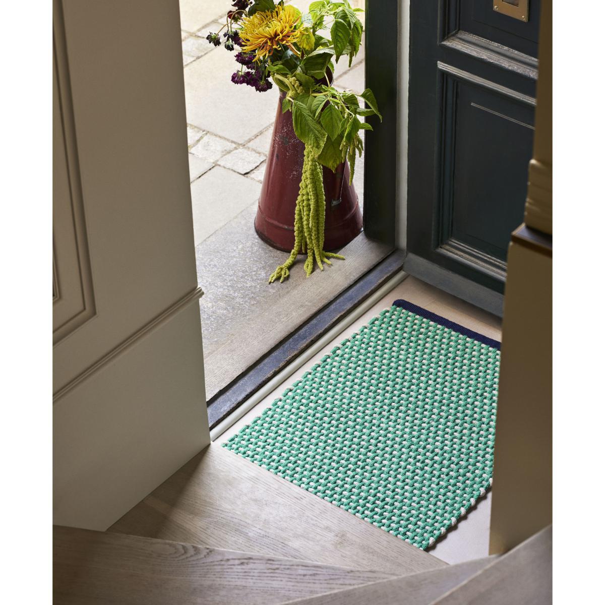 A cheerful, graphic style for this thick rug which presents a two-tone relief weave for a most beautiful effect. Edged with two bands of contrasting colour, this rug is perfect to brighten up your decor. It’s available in a wide variety of colour combinations. Its size is perfect to be used as a bath mat, bedside rug, in front of a sink or as a doormat in front of a door.