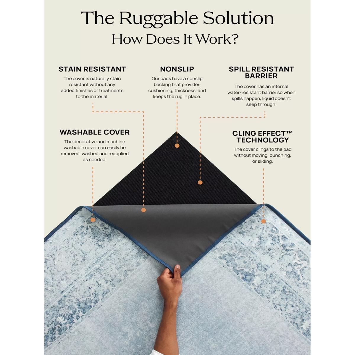 Elevate your favourite space with the distressed Rayne Rug. Inspired by intricate artistry, this globally-inspired design features an ornate border and deep motifs, complemented by subtle pops of colour. Water-resistant, stain-resistant, and machine-washable. Rug colours may vary slightly according to your device and the lighting in your space. When it comes to washable rugs, Ruggable stands out from the pack. Thoughtfully designed and created to withstand whatever life throws at them: dirt, dust, spills, and even pet accidents. The rugs are fully machine washable, making it easy and affordable to keep them clean. The low-pile, flatwoven washable rugs feature a non-toxic, water-resistant barrier that shields your floors from everyday stains, spills, and unwanted odours. The rug pads feature non-slip latex-free backing to keep your rug in place. Rugs look new again after each wash and they have water-resistant protection that doesn't deteriorate after washing. The 2-piece system allows the non-slip grip to stay out of the washing machine and your rug to stay in place. Ruggable rugs are pet-friendly, kid-friendly, and life-friendly. No stress over spills, soft for tiny toes & paws, and safe & non-toxic.