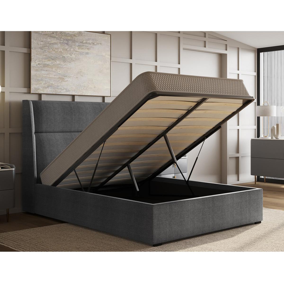 A beautiful contemporary styled bed frame featuring a comfortable cushioned winged headboard and a low foot end that will enhance the feeling of space in the room. The Rumba will be the focal point in your bedroom and the high quality grey fabric upholstery will work well with most design schemes. This fabulous bed not only looks amazing but is practical too, with a great storage space underneath, perfect for storing bedding and accessories. The underbed compartment is quick and easy to access with the help of a gas lift mechanism. The Rumba has a sprung slatted base that will work in conjunction with the mattress to create a comfortable supportive feel. The wooden slats have a natural bounce and will adjust to your profile where you exert the most pressure.
