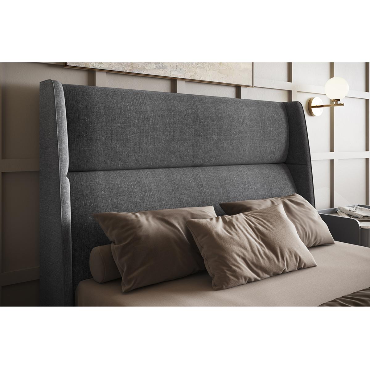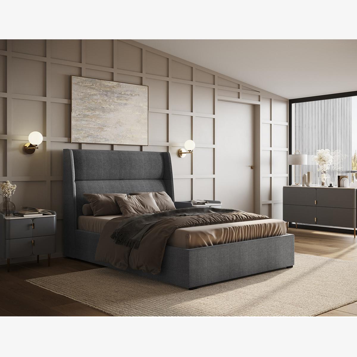 A beautiful contemporary styled bed frame featuring a comfortable cushioned winged headboard and a low foot end that will enhance the feeling of space in the room. The Rumba will be the focal point in your bedroom and the high quality grey fabric upholstery will work well with most design schemes. This fabulous bed not only looks amazing but is practical too, with a great storage space underneath, perfect for storing bedding and accessories. The underbed compartment is quick and easy to access with the help of a gas lift mechanism. The Rumba has a sprung slatted base that will work in conjunction with the mattress to create a comfortable supportive feel. The wooden slats have a natural bounce and will adjust to your profile where you exert the most pressure.