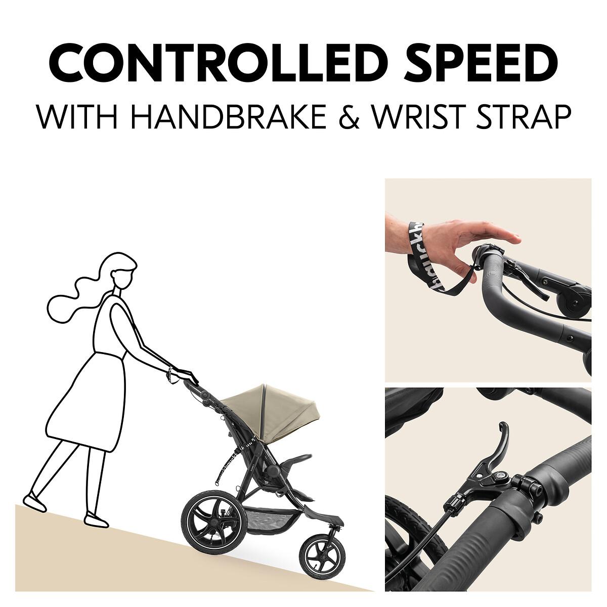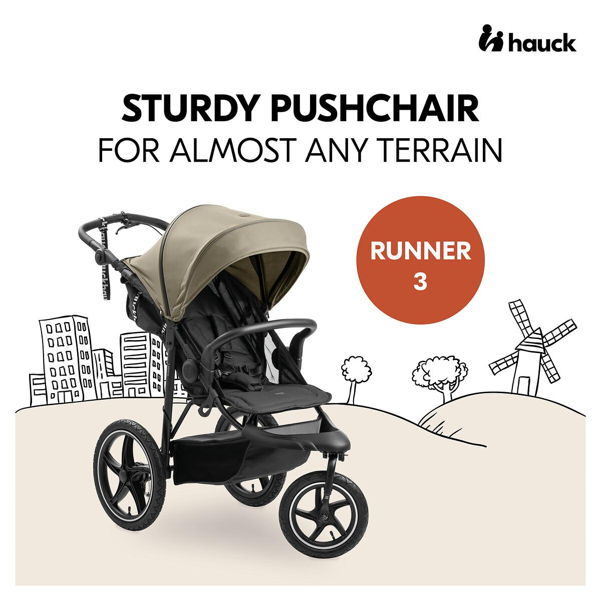 Robust pushchair for almost any terrain. XL pneumatic wheels & suspension3 XL sprung, all-terrain pneumatic wheels: Runner 3, with dual-adjustable rear suspension & lockable front wheel: Adventure time!Uphill and down – with the handbrake, you also have good control of your speed. And the height-adjustable rubber handlebar, with hand strap, makes for a really comfortable grip. For big kids too. Is your child bigger than average? In the soft seat with extra-long backrest, kids up to 22 kg ride comfortably, whether upright or in a lying position. Is the sun too bright? The generous sun canopy, with folding visor, will protect your little darling (UV protection 50+). You can even extend the canopy with the zip. Practical storage space. Taking the baby things with you? Everything fits in the large, lockable basket – and nothing falls out. Keep your mobile phone and keys handy in the zip pocket on the canopy. In the mood for a trip? You can easily fold up the Runner 3 pushchair. If necessary, you can remove the rear wheels in no time. This makes it even easier to transport the pushchair. Do you just love a cappuccino and want to be able to quickly put it down when you're needed? With the pushchair's practical cup holder, that works just fine!Product Dimensions:116x 62x 107cm14.1kg. Filling: 100% Polyester, MDF board, Metal, PU-Foam (Bar), Plastic, Polyester, Steel, Top: 100% Polyester. One Size. This product will be dispatched by one of our trusted suppliers. You’ll be contacted by their selected courier about your delivery. HAUCK01