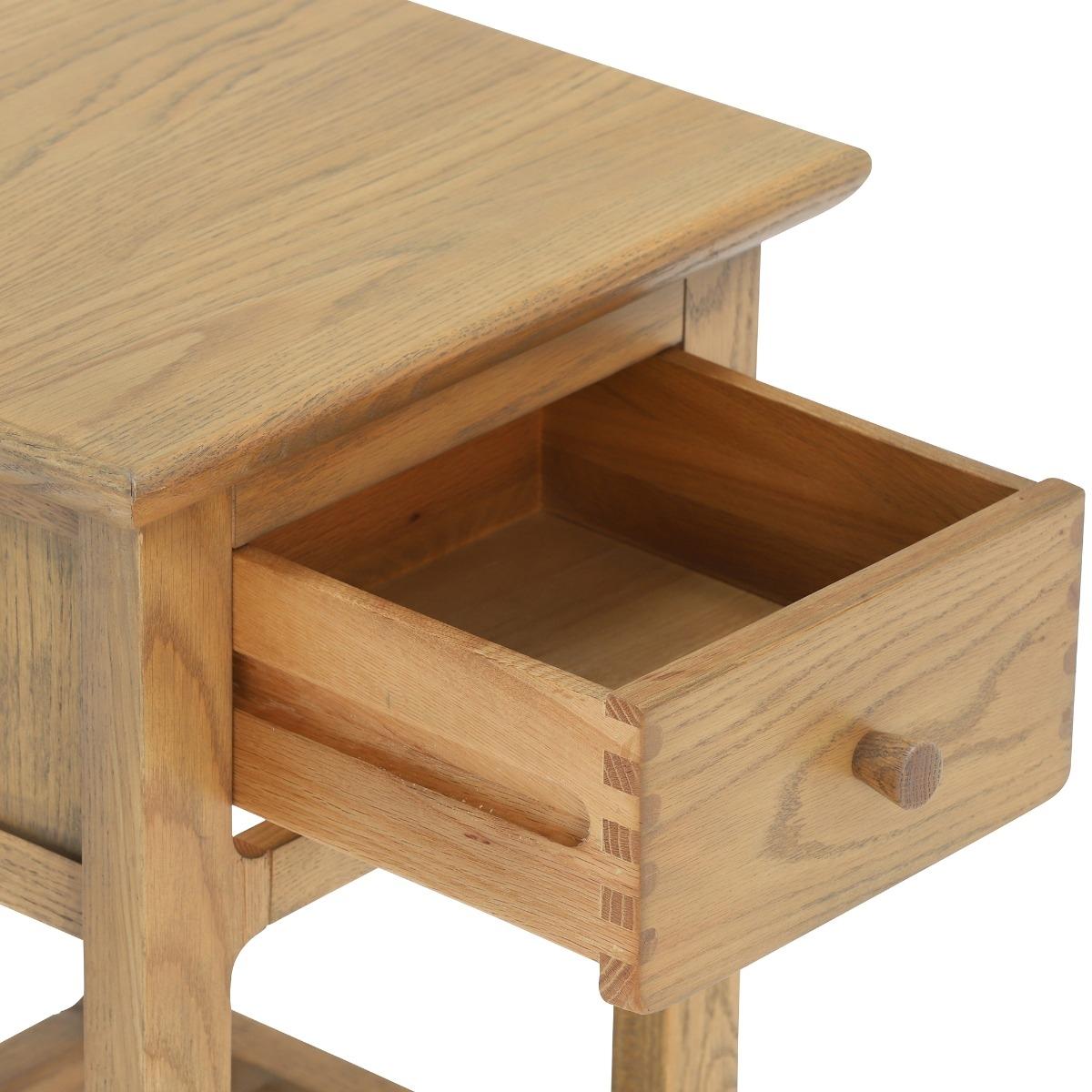 Design. The Runswick Bedside Table is compact and has a beautiful rustic look to it thanks to the smoked oak wood. With a small drawer to hide away bits and bobs and enough space to fit a lamp or accessory on top, the Runswick Bedside Table is the ideal way to introduce your style into your bedroom.