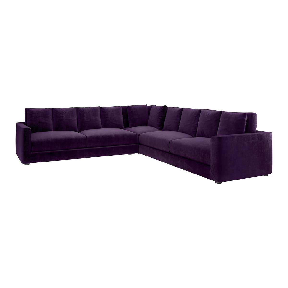 Italian made Rupert large reversible corner sofa is upholstered in high quality, plush velvet purple. Generous seat and back cushions are feather and fibre filled to make the sofa ultra comfortable.