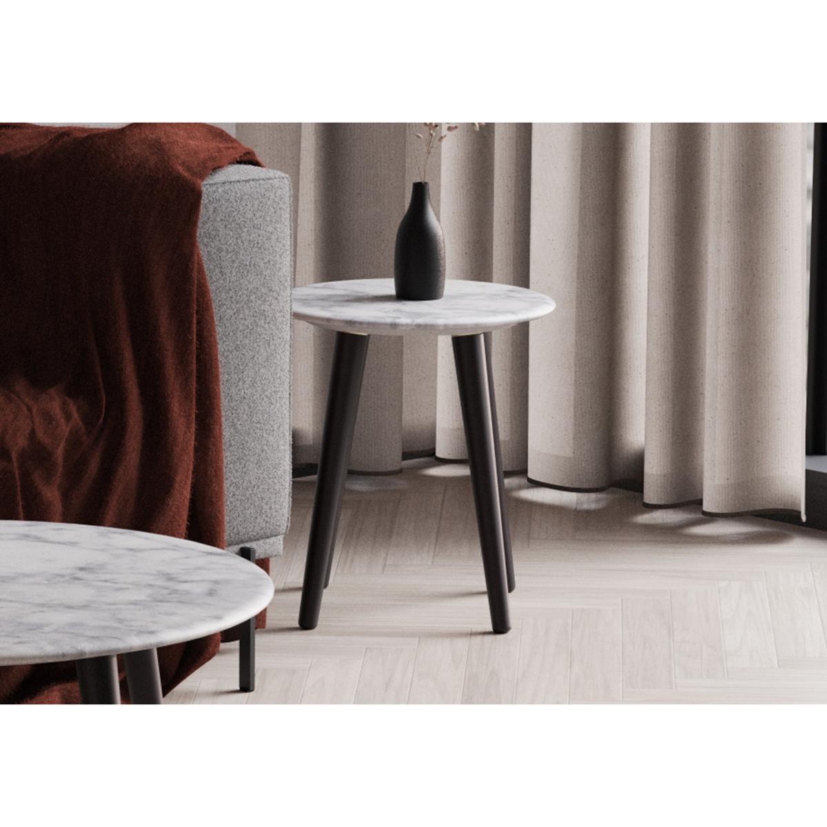 This round marble side table is the perfect way to showcase your favourite table lamp and also works beautifully as an elegant and compact bedside table. Why you'll love it Timeless, elegant and versatile. This beautiful round side table has a solid marble top. Gorgeous white marble with natural veining and patterning. As every piece of marble is unique, every Russo round coffee table is one of a kind. Smooth tapered wood legs in a contrasting dark tone. A statement piece that’s the perfect size for a modern living room. This round side table is part of the Russo range. What you need to know Simple self-assembly required. Marble top. Rubber wood legs. Marble is hardwearing but not indestructible, so it’s important to care for it properly. Spillages need to be removed immediately. To clean, wipe gently with a damp cloth using warm water, then buff dry. We recommend that you use coasters and placemats to protect against heat and moisture. Do not use knives to cut food on a marble table top, use as a work top, place heavy weights on the table or use acidic or abrasive cleaners. You should never sit or stand on a marble surface. For more advice on caring for your marble furniture, see our Dining care guide.