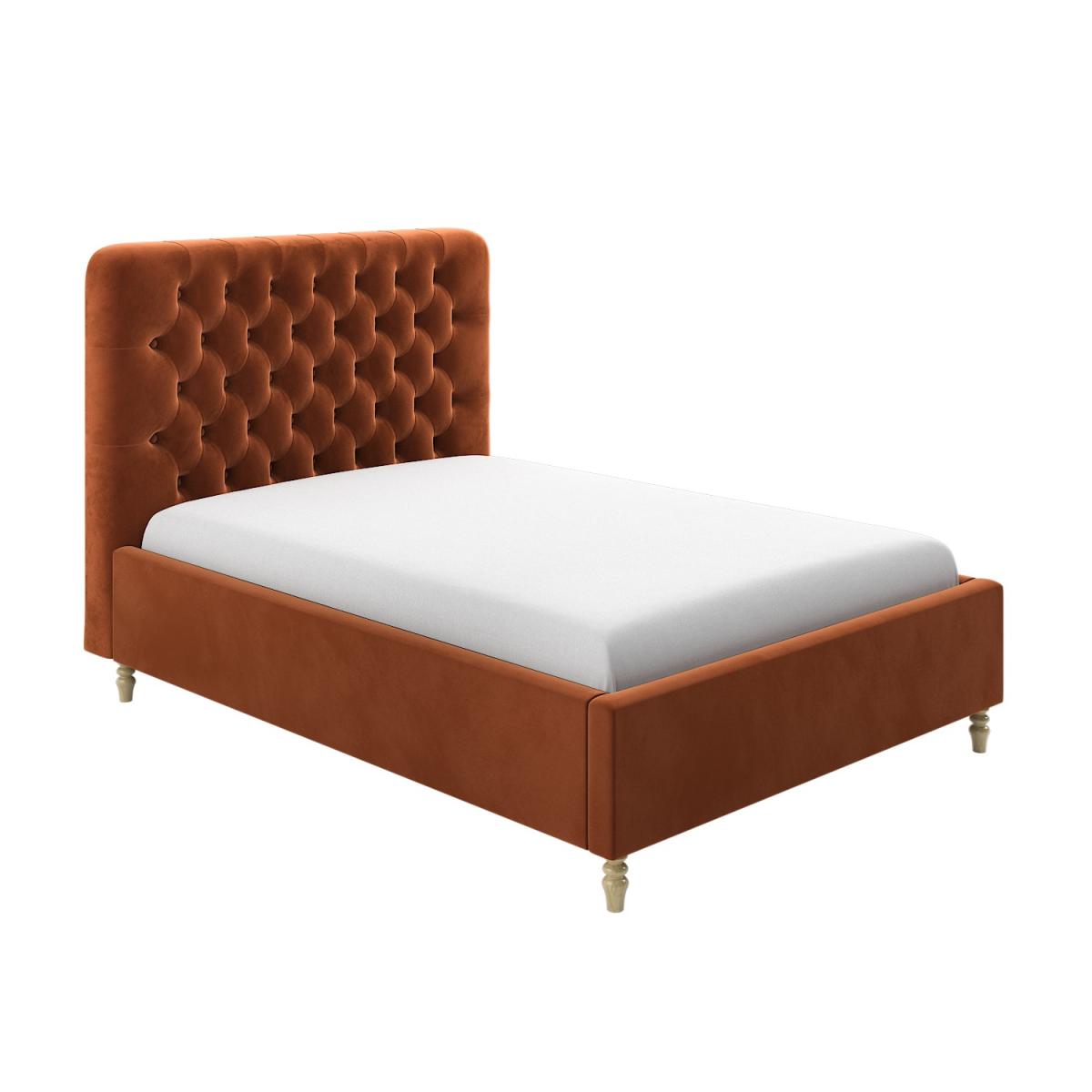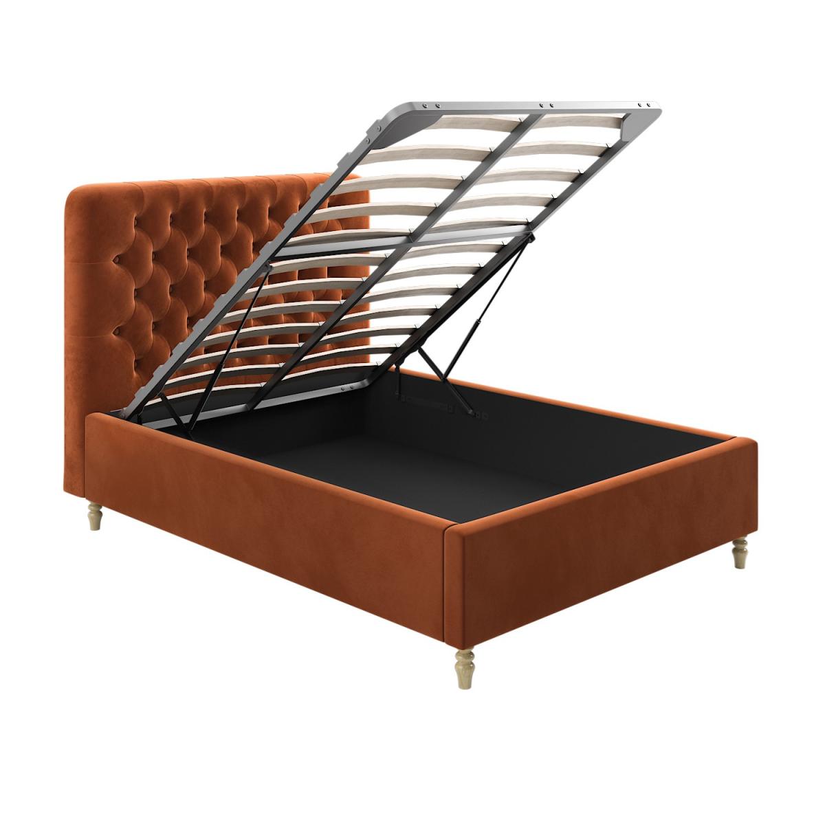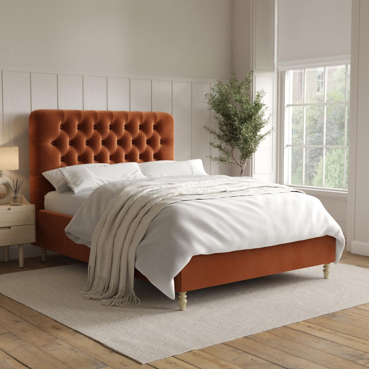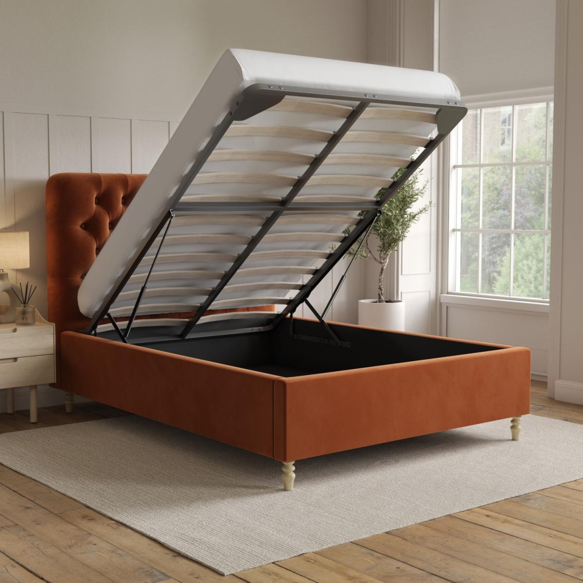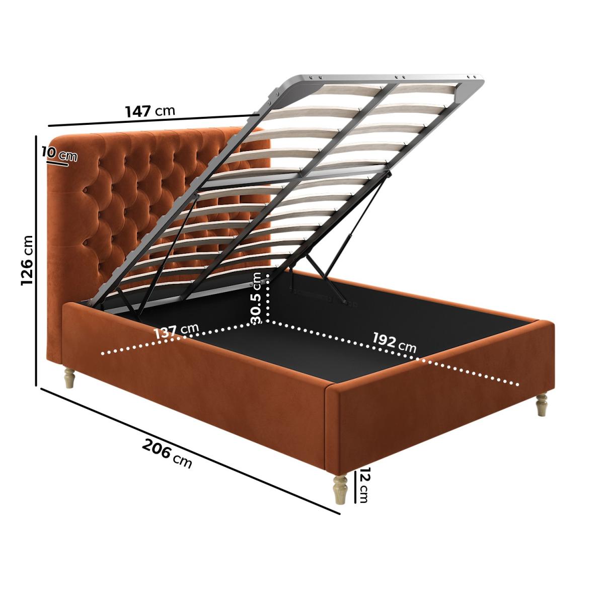 All about me Add a pop of colour to any modern bedroom with the Pippa ottoman bed in a stunning rust colour, and the solid light wood turned legs add a traditional touch. The end-opening ottoman is easy to access, and the fabric-lined base protects your stored items. It features a sprung-slatted base for ultimate comfort, and fits a standard UK double mattress. Need to know Dimensions:W147 x D206 x H126 cm Weight: 56 kg Mattress size: Standard UK Double (4ft6) Mattress included: No Gas lift supported weight: 75 kg Colour: Rust Finish: Upholstered Material: Velvet fabric Bed base: Sprung-slatted Assembly required: Yes Packaging dimensions: Box 1- W151 x D130 x H15 cm,Box 2- W198 x D33 x H21.5 cm