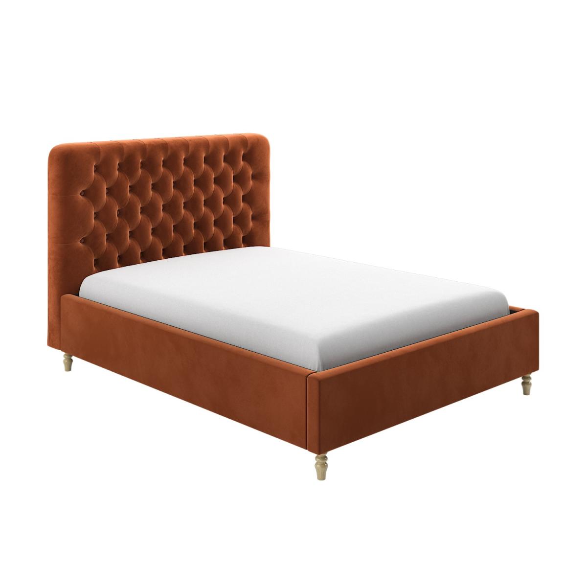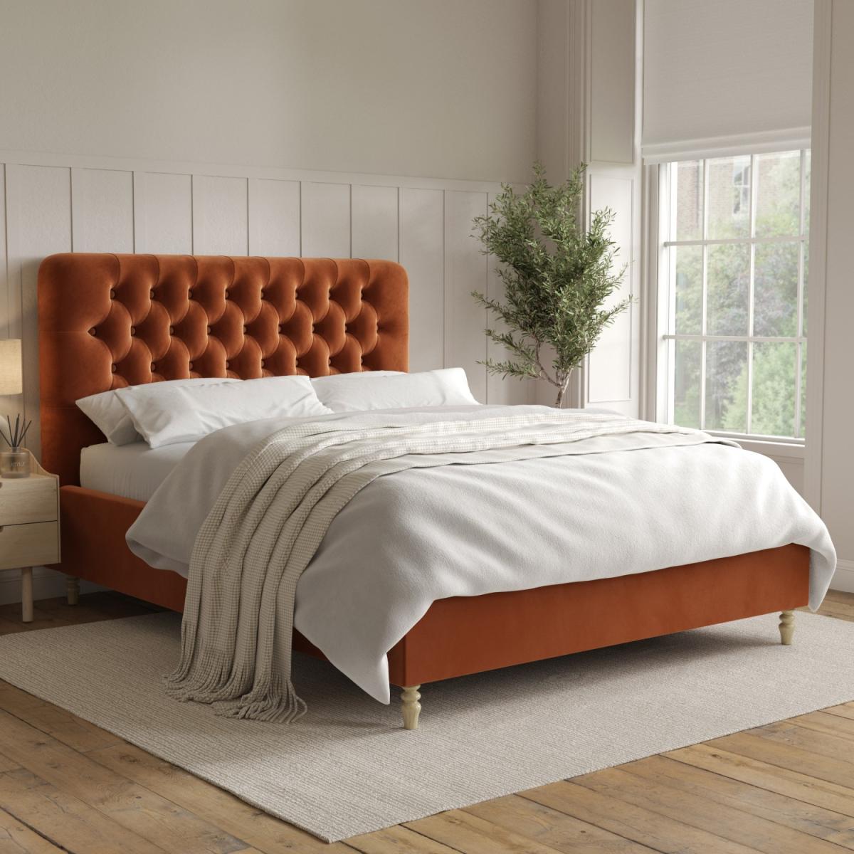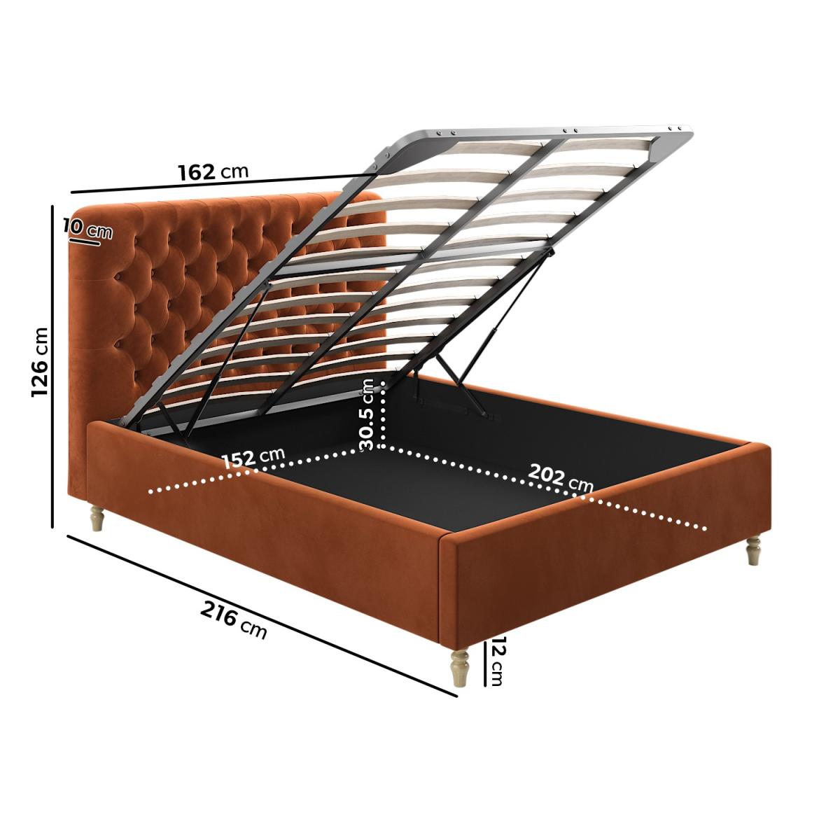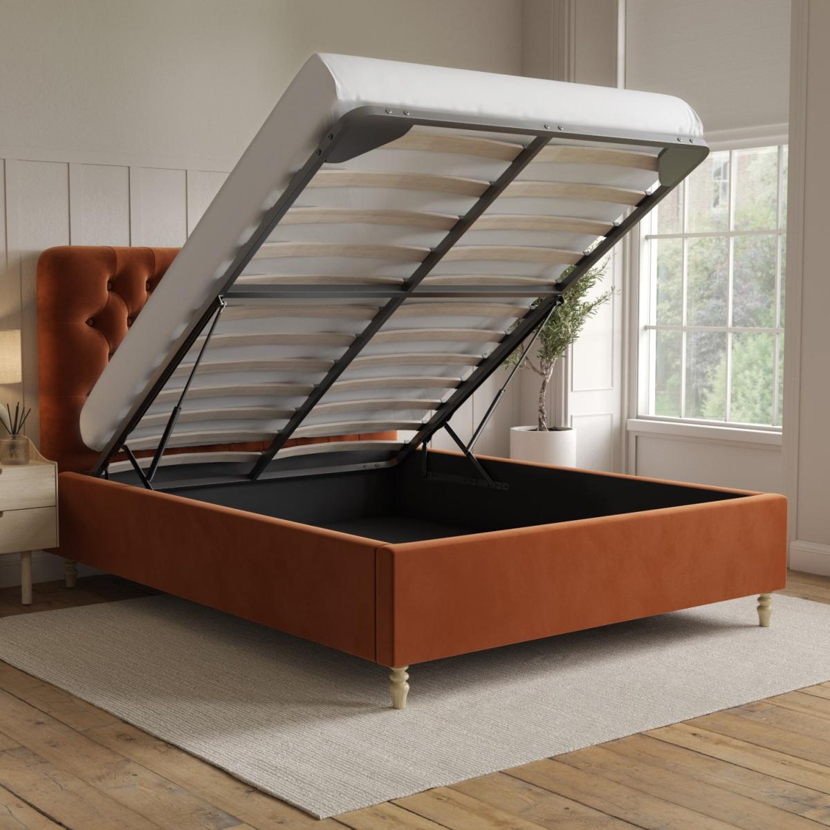 All about me Add a pop of colour to any modern bedroom with the Pippa ottoman bed in a stunning rust colour, and the solid light wood turned legs add a traditional touch. The end-opening ottoman is easy to access, and the fabric-lined base protects your stored items. It features a sprung-slatted base for ultimate comfort, and fits a standard UK king size mattress. Need to know Dimensions: W162 x D216 x H126 cm Weight: 61 kg Mattress size: Standard UK King Size (5ft) Mattress included: No Gas lift supported weight: 75 kg Colour: Rust Finish: Upholstered Material: Velvet fabric Bed base: Sprung-slatted Assembly required: Yes Packaging dimensions:Box 1- W166 x D130 x H15 cm, Box 2- W208 x D33 x H21.5 cm