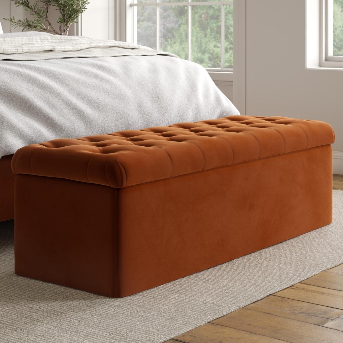 All about me. With its rich colour and plush upholstery create an instant focal point in your bedroom with our classic Pippa blanket box which looks beautiful placed at the end of a bed or beneath a window. Store bedding and towels discreetly inside then use the top to sit on whilst getting ready. There's no assembly required so you can use it right away. Need to know. Dimensions. W130 x D46 x H44 cm Colour. Rust orange Finish. Upholstered Material. Velvet Number of hinges. 3 Weight capacity. 150 kg Assembly required. No.