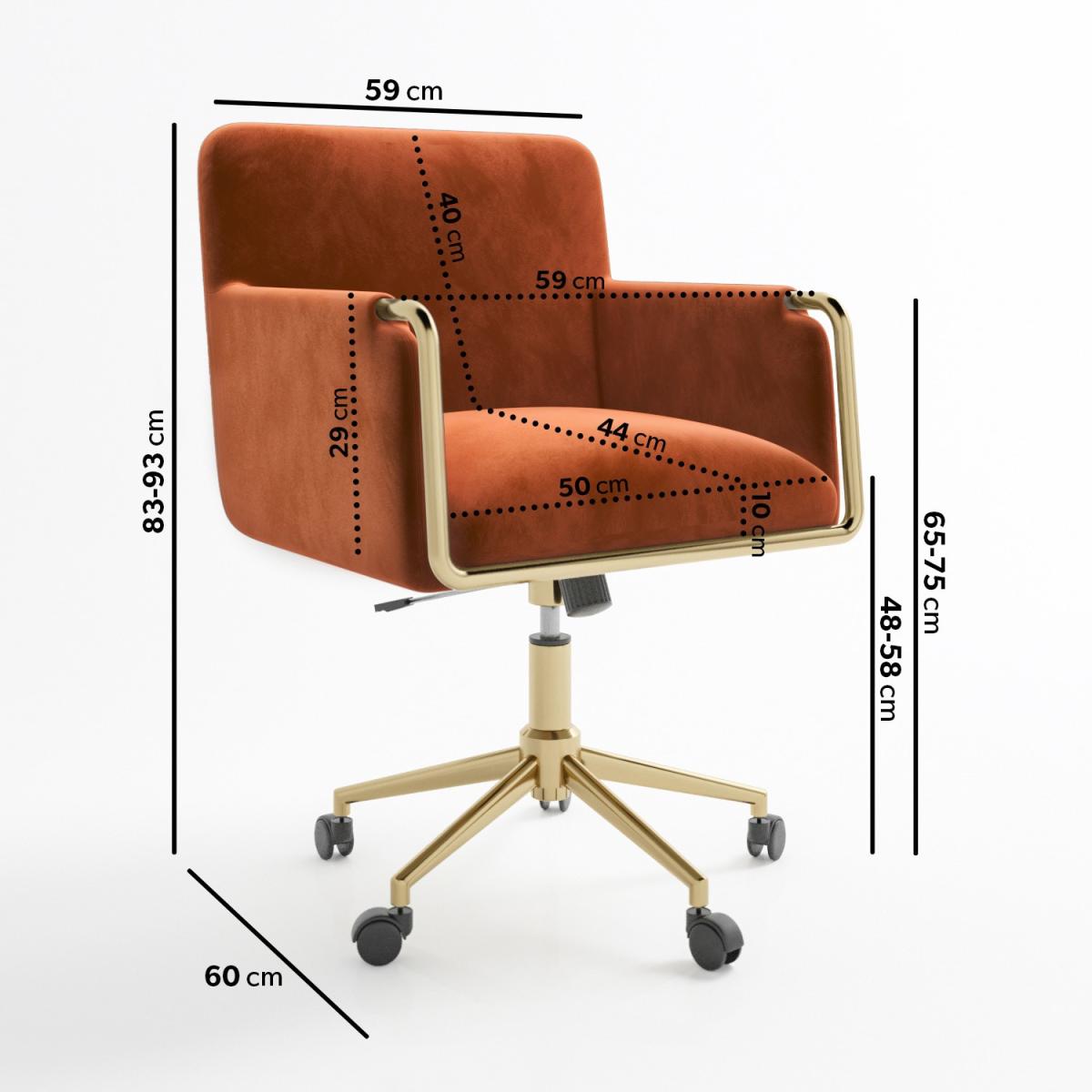 Built with comfort and convenience in mind, this sleek office chair would enhance any office or home study. It features five wheels with castors which give you a 360⁰ degree swivel and freedom whilst you work. Plus, you can set it to the perfect working height with the gas-lift mechanism. Upholstered in a soft-to-touch velvet and contrasting polished gold base, it's versatile enough to coordinate with existing furniture.