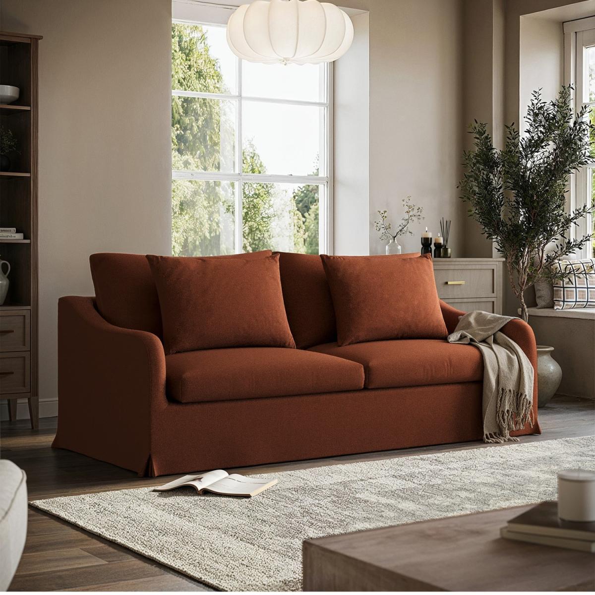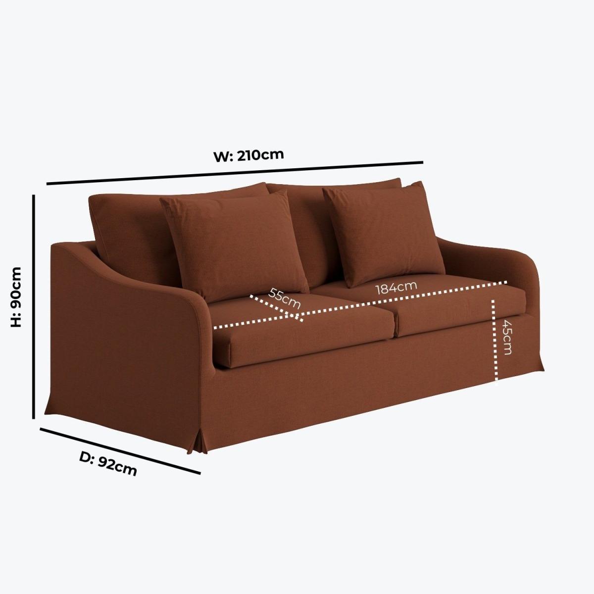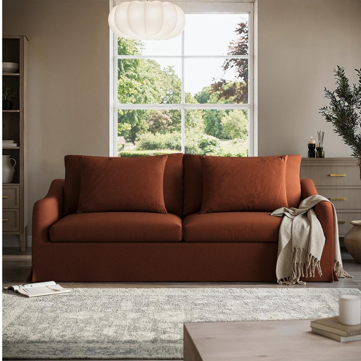 Foam filled Upholstered in a warm and inviting rust brown loose cover fabric, its earthy tone and gentle curves blend effortlessly with any interior style. Perfect for family living rooms, cosy lounges, or entertaining guests in style. Includes two scatter cushions for extra comfort and the finished look. Reversible back and scatter cushions with a fully removable slipcover that makes cleaning and maintenance a breeze, perfect for homes with kids or pets. Generously padded throughout with a spongy foam filling for the perfect blend of comfort and support. The Eliza 3-seater sofa blends minimalist design with everyday practicality. Upholstered in a soft, warm and earthy rust brown fabric, it’s a versatile addition that complements any decor. Its loose, easy-clean slipcover is removable, perfect for busy homes with children or pets. Its gently curved arms, skirted detail and soft silhouette bring a modern, relaxed feel, while the spacious seat and scatter cushions provide comfort and support for the whole family. For added convenience, the back cushion and scatter cushions are fully reversible, ideal for maintaining a fresh look with ease.