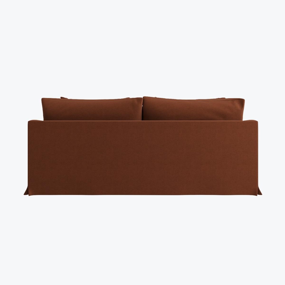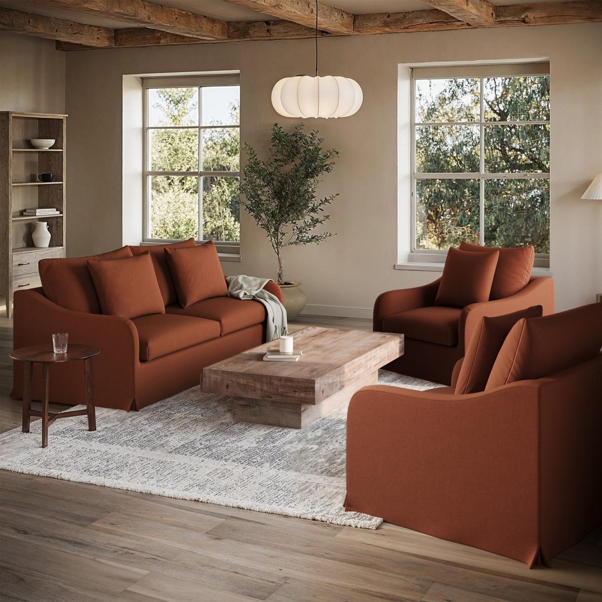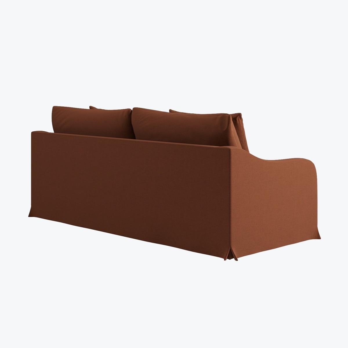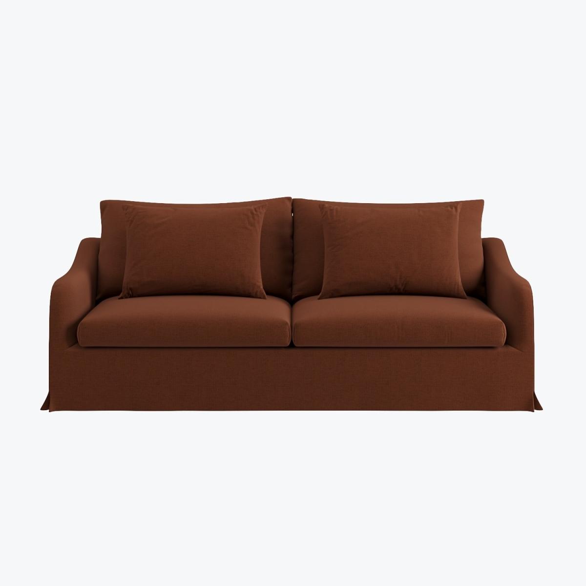 Foam filled Upholstered in a warm and inviting rust brown loose cover fabric, its earthy tone and gentle curves blend effortlessly with any interior style. Perfect for family living rooms, cosy lounges, or entertaining guests in style. Includes two scatter cushions for extra comfort and the finished look. Reversible back and scatter cushions with a fully removable slipcover that makes cleaning and maintenance a breeze, perfect for homes with kids or pets. Generously padded throughout with a spongy foam filling for the perfect blend of comfort and support. The Eliza 3-seater sofa blends minimalist design with everyday practicality. Upholstered in a soft, warm and earthy rust brown fabric, it’s a versatile addition that complements any decor. Its loose, easy-clean slipcover is removable, perfect for busy homes with children or pets. Its gently curved arms, skirted detail and soft silhouette bring a modern, relaxed feel, while the spacious seat and scatter cushions provide comfort and support for the whole family. For added convenience, the back cushion and scatter cushions are fully reversible, ideal for maintaining a fresh look with ease.
