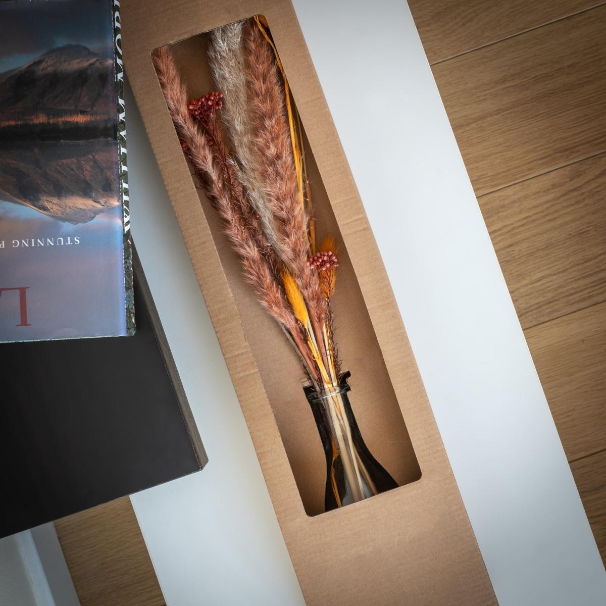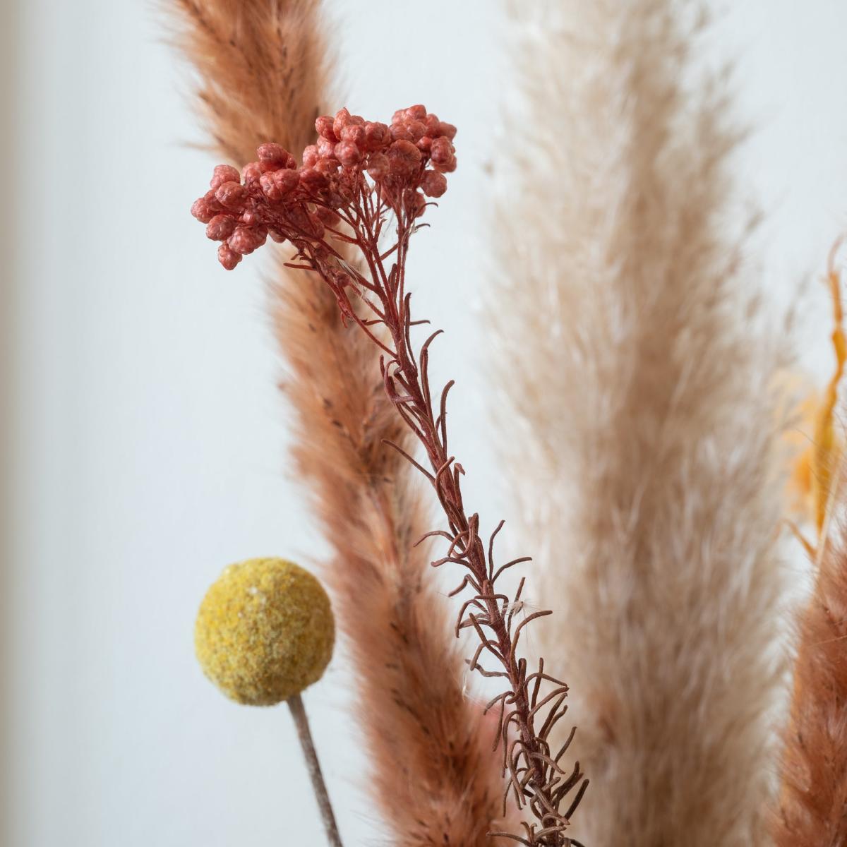 * Mix of Pampas, Bunny Tails and Craspedia G* lass bottle design* Gift boxed* For indoor use only A lovely mix of dried floral in dusky reds and rusts, this set includes a gorgeous variety of pampas, bunny tails and craspedias inside a modern glass bottle vase. Each item- comes gift boxed to make the perfect gift, whether it's a house warming gift, a thank you or a 'just because' gift.**Please note:** Due to the nature of this product, some shedding may occur during and after delivery. Keep away from direct sunlight and humidity, ideally in a cool, dry place. Do not add water.